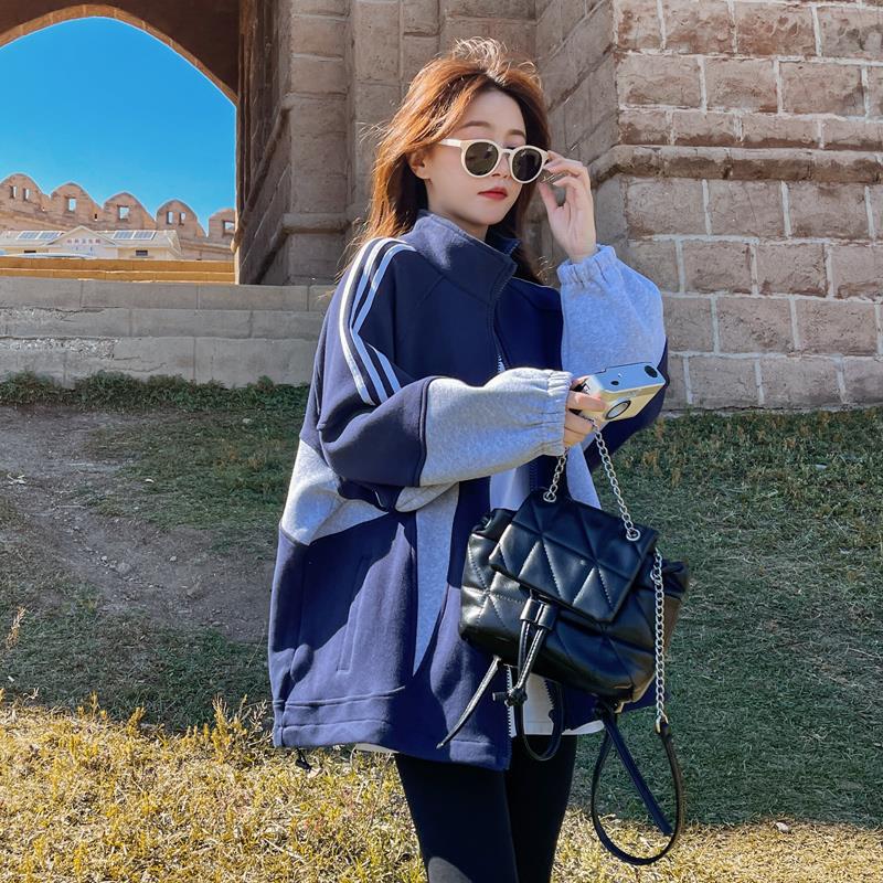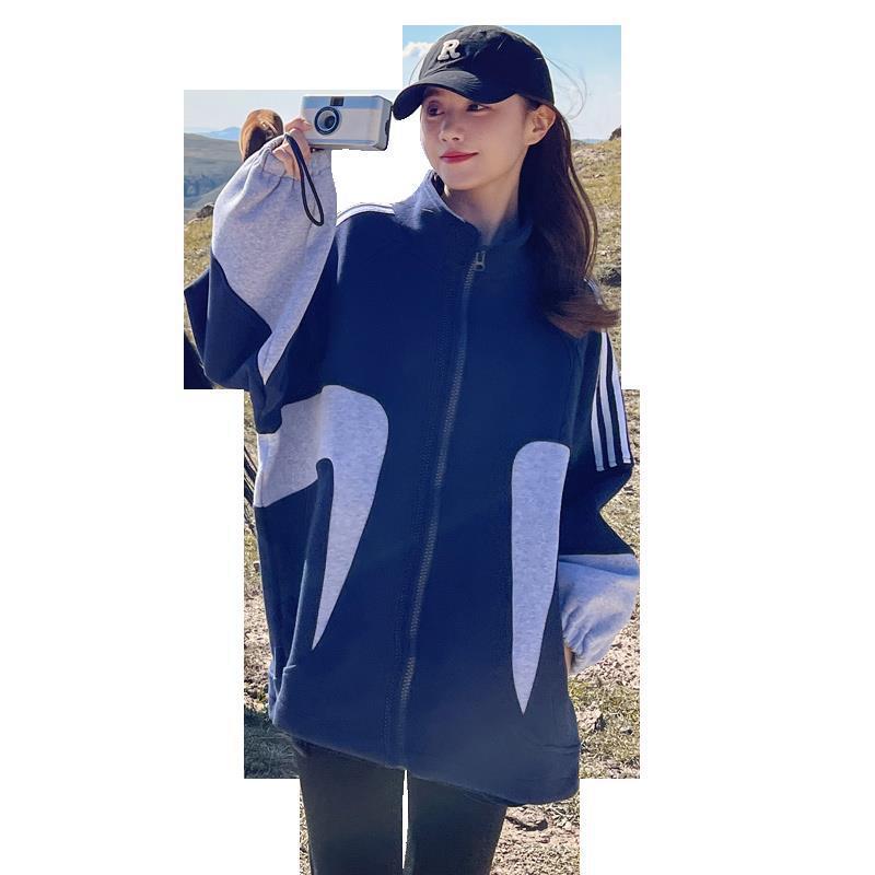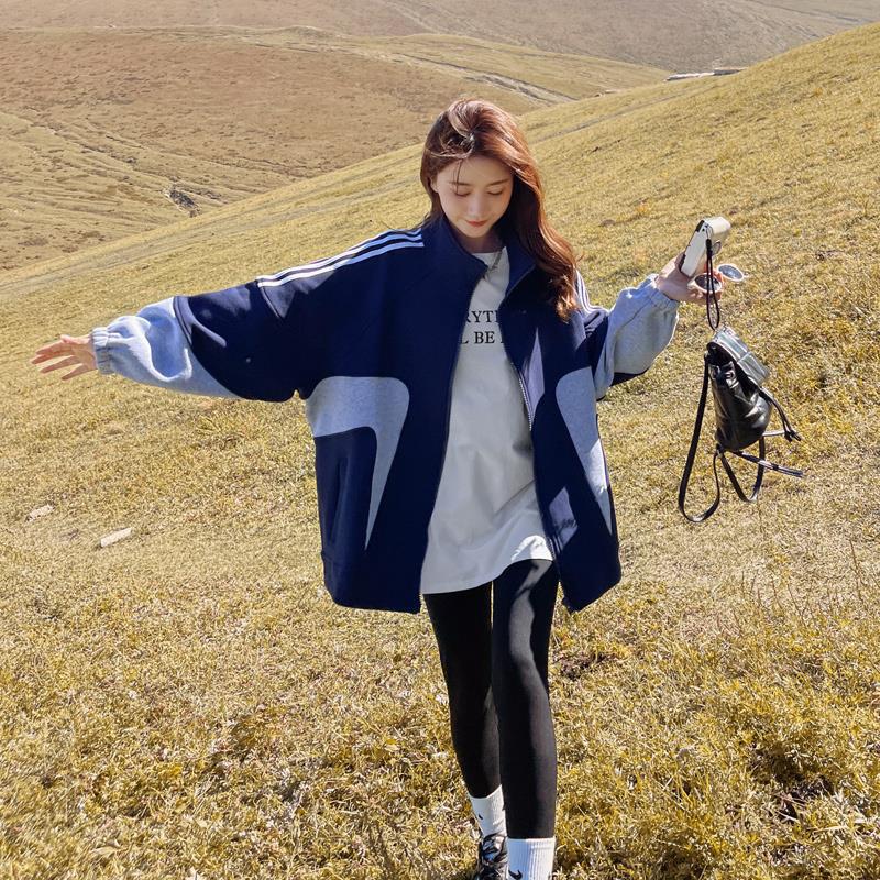 Fashion dark blue coat for women Spring and Autumn 2024 New loose casual lazy style contrast color stitching baseball uniform fashion