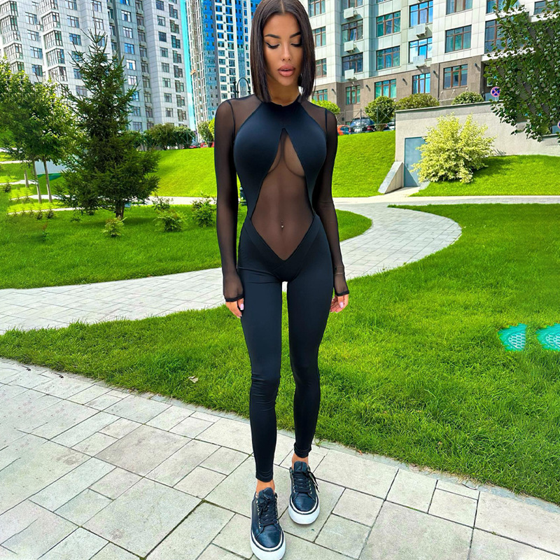 Fashion mesh stitching slim jumpsuit European and American style 2023 autumn women’s new long sleeve zipper trousers wholesale