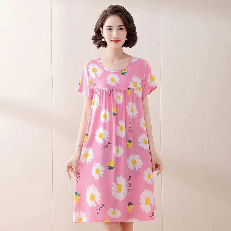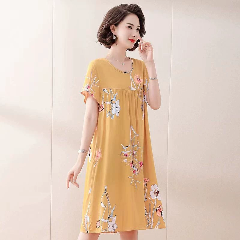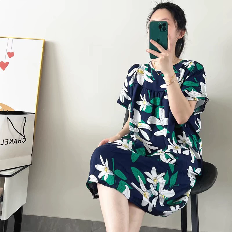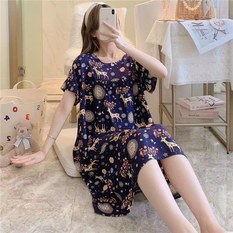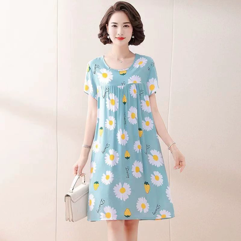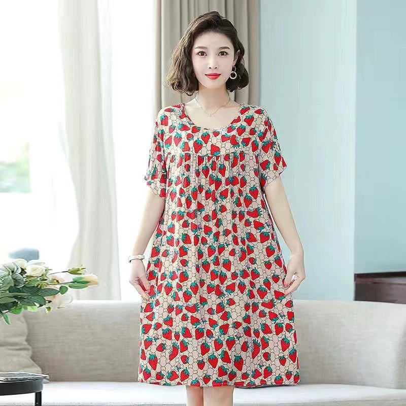 | nameOriginal | Fashion printed dress women's short-sleeved round neck loose large size nightgown summer thin home casual cotton silk skirt |