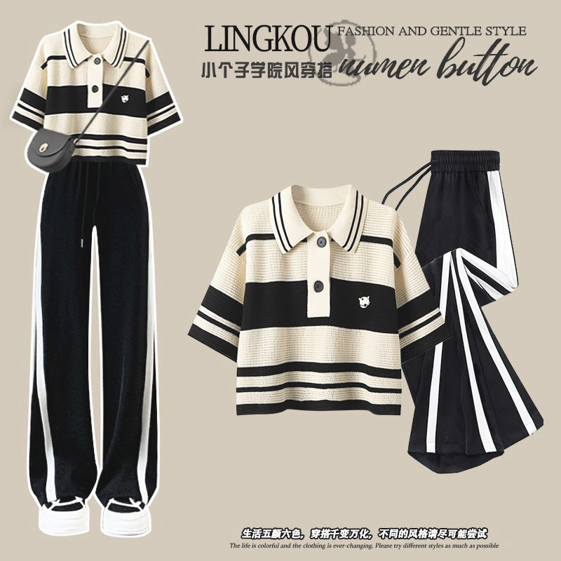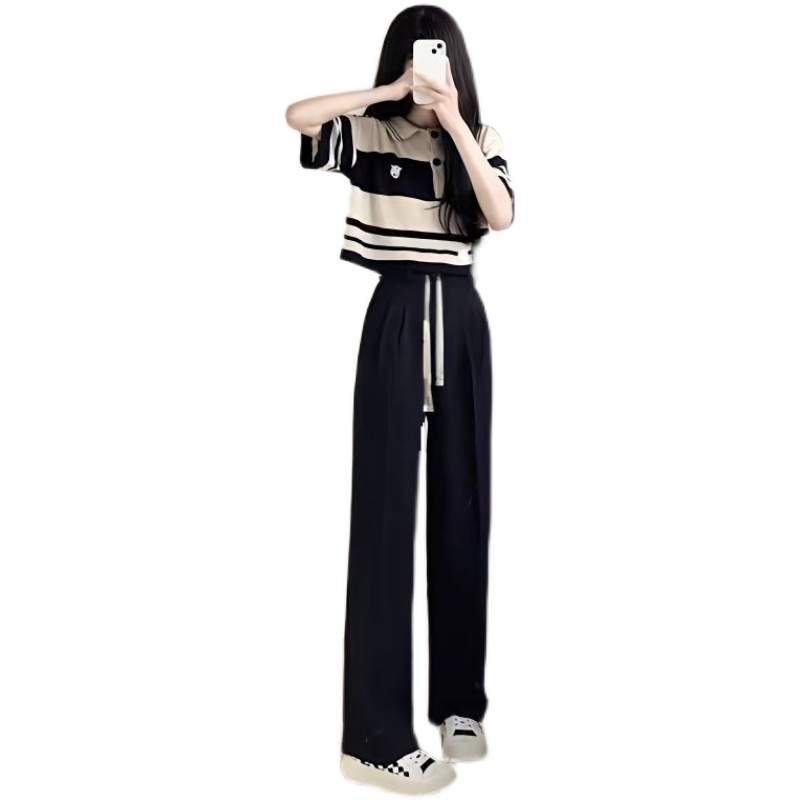 | nameOriginal | Fashion Set Summer Women's New Korean Style Loose College Style Striped Polo Collar Top Wide Leg Pants Two-piece Set |