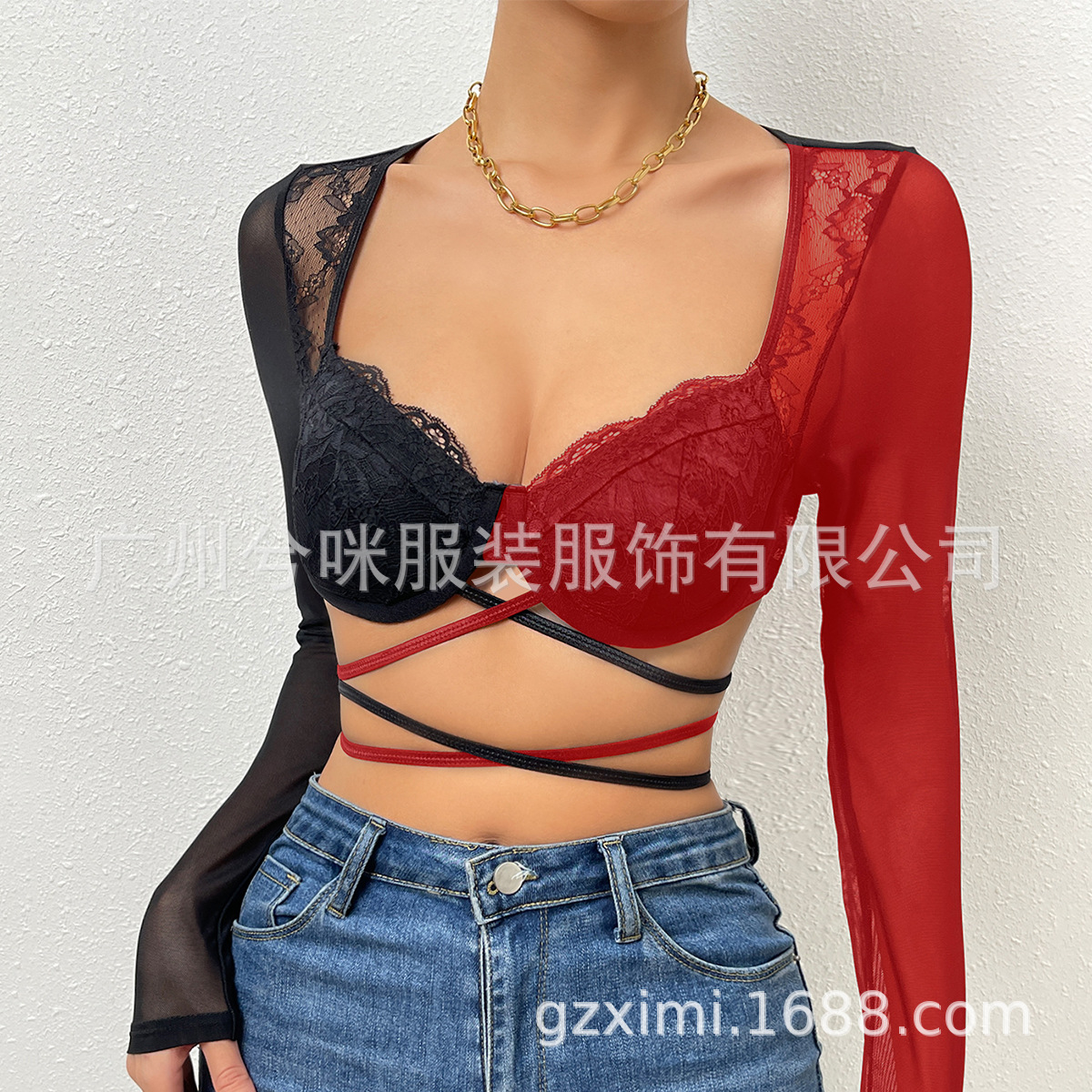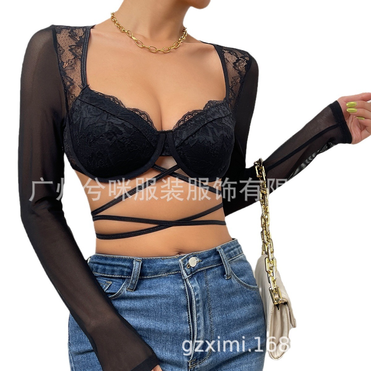 Fashion Sexy Deep V Lace Cross Steel Ring Lace Lace Umbilical Open Umbilical Slim-Fit Perspective Ins Mesh Long Sleeve Small Top