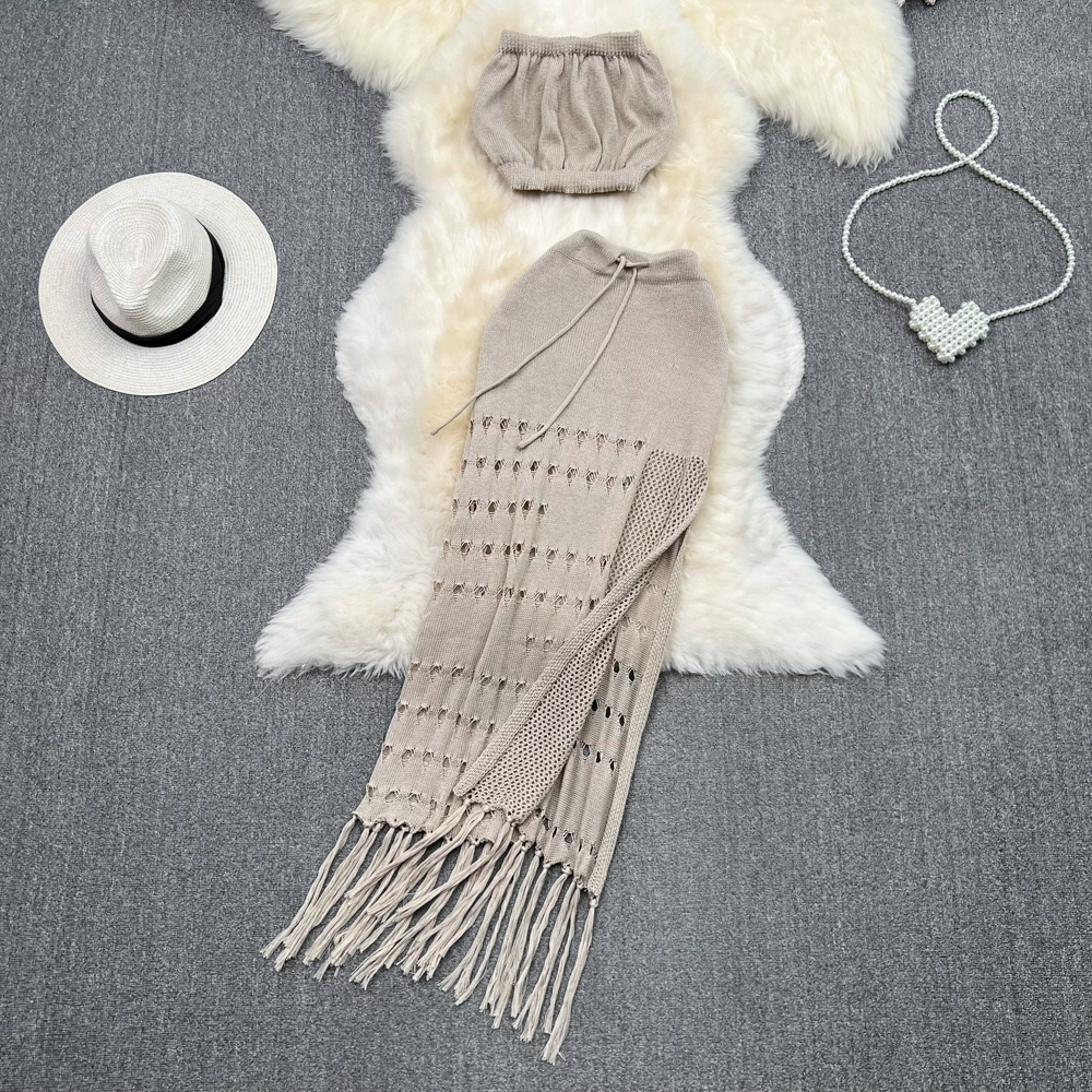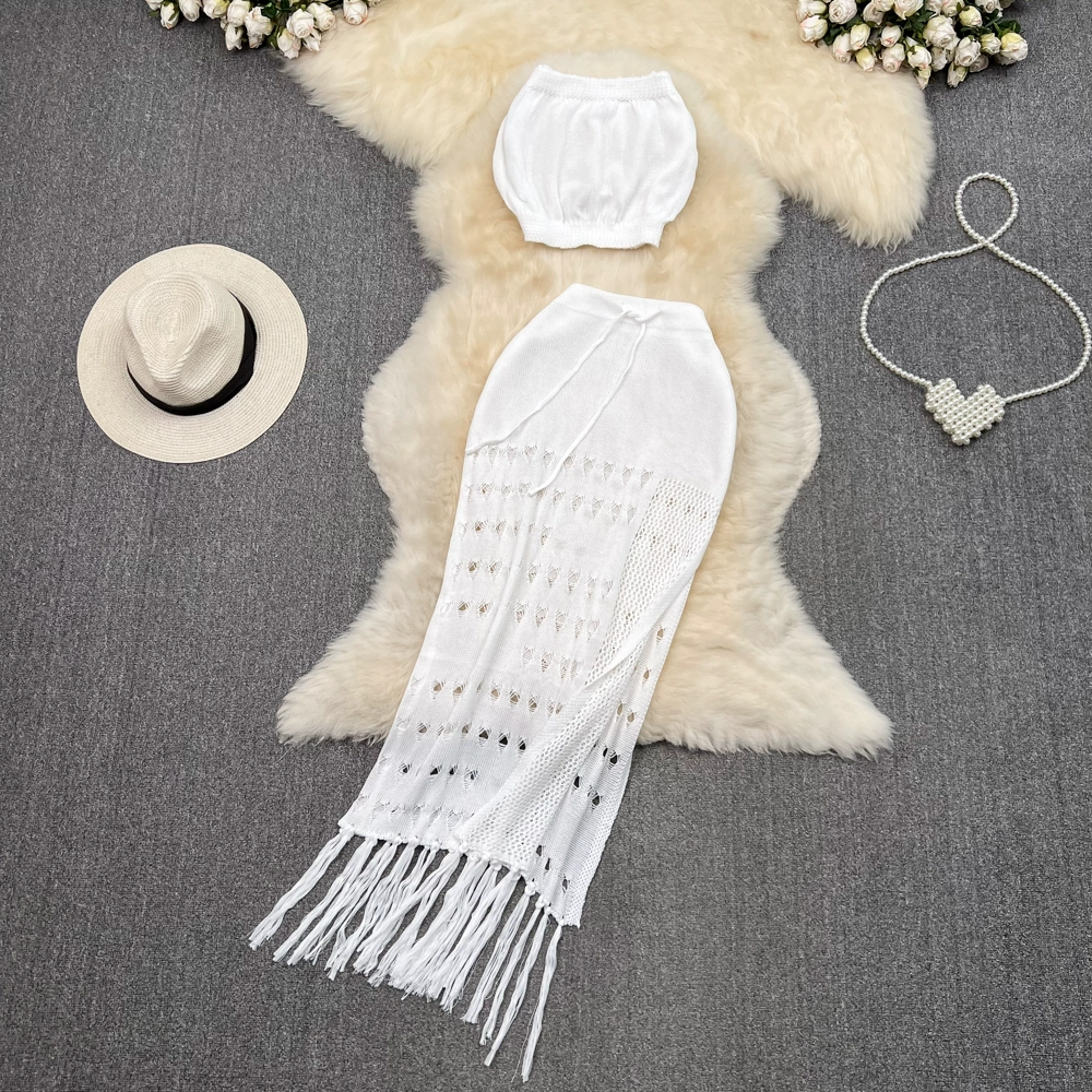 | nameOriginal | Fashion suit for hot girls sexy tube top two piece set high waist slimming hollow tassel slit skirt summer |