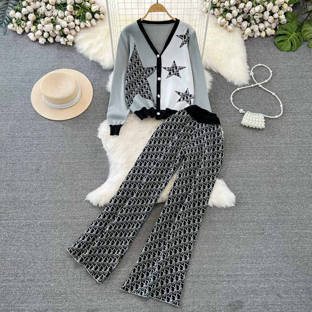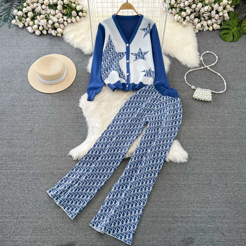 | nameOriginal | Fashion suit for women in autumn and winter V-neck single-breasted five-pointed star jacquard knitted jacket two-piece set high-waisted wide-leg pants |