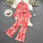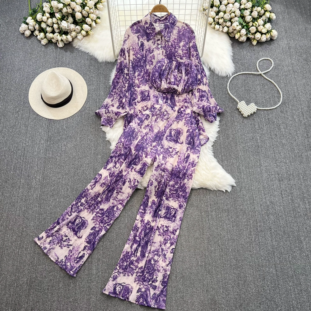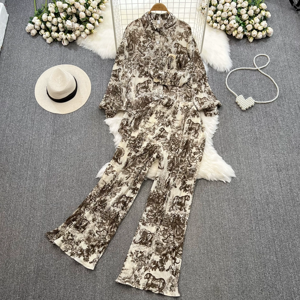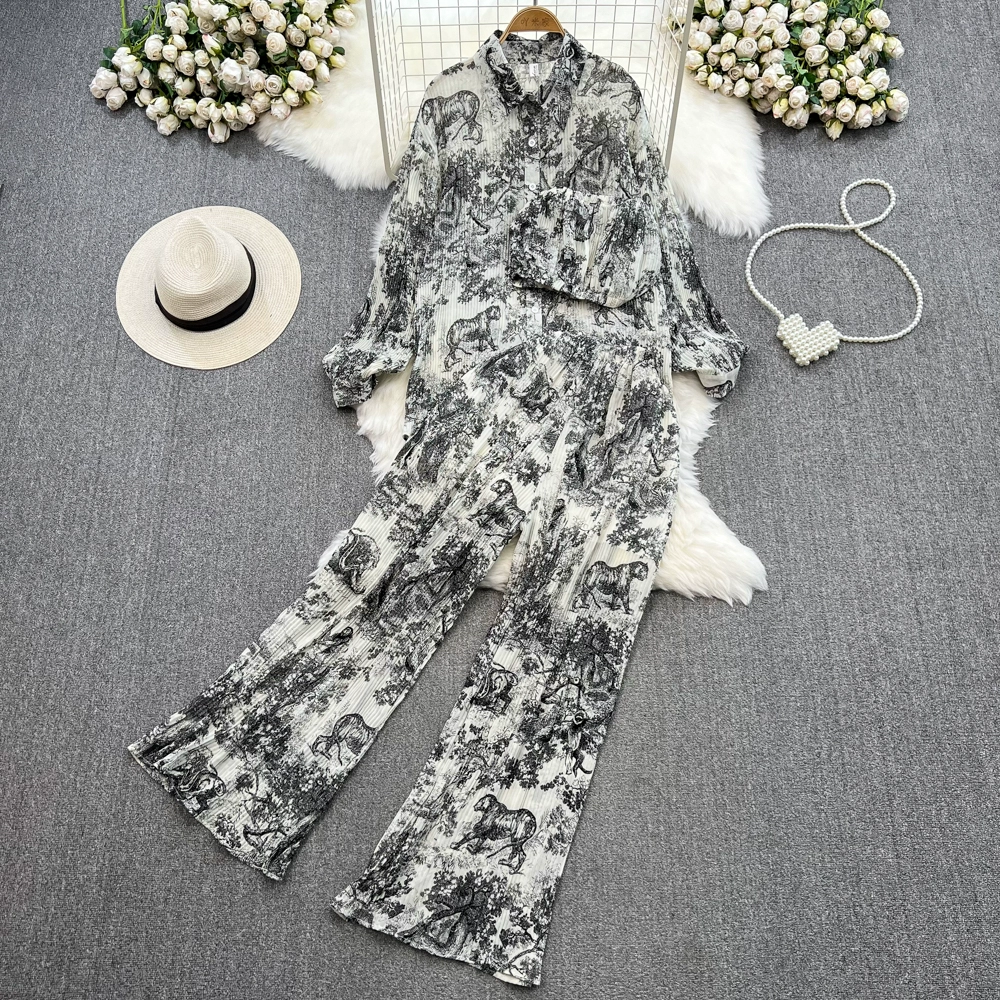 Fashion suit for women, Korean version, lantern sleeves, loose single-breasted, smudged print shirt, three-piece set, high-waisted, wide-leg pants