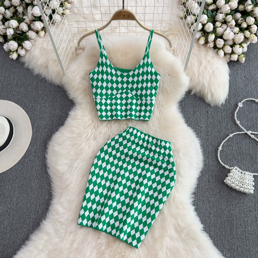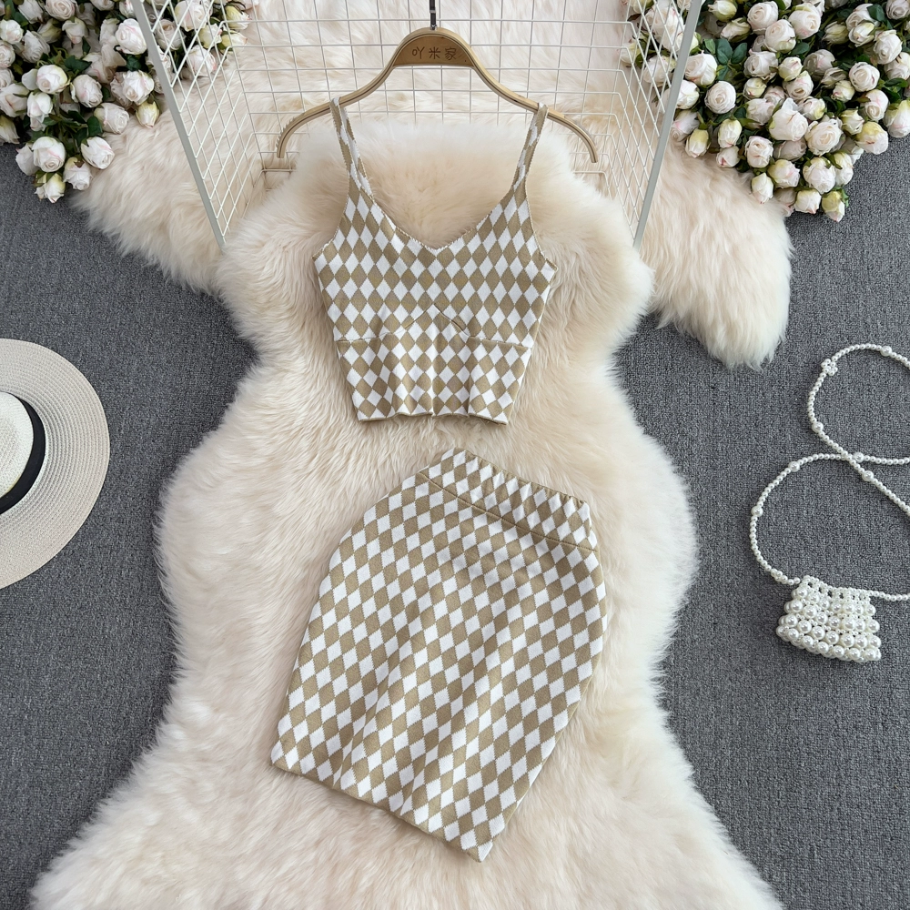 | nameOriginal | Fashion suit for women, pure desire, sexy checkerboard pattern, slim fit, navel-baring camisole, two-piece set, high waist, hip-covering skirt |