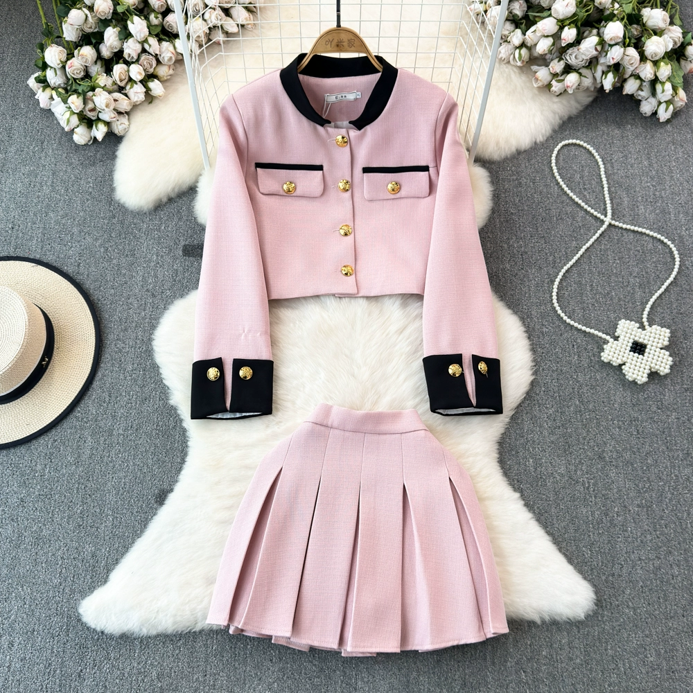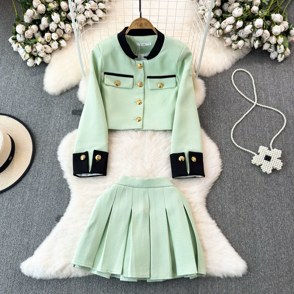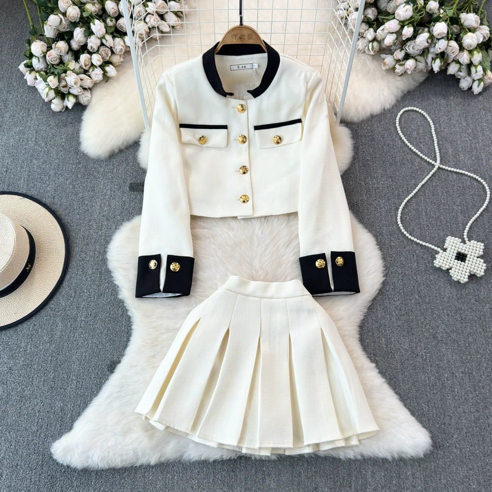 Fashion suit for women, small fragrant style, contrasting color, long-sleeved, stand-up collar, woolen coat, two-piece set, high-waisted, slimming, pleated skirt