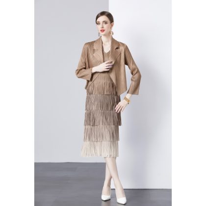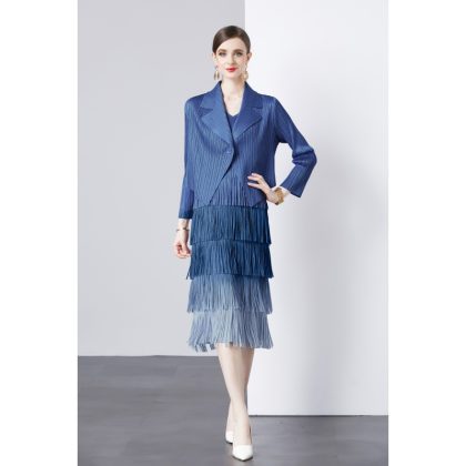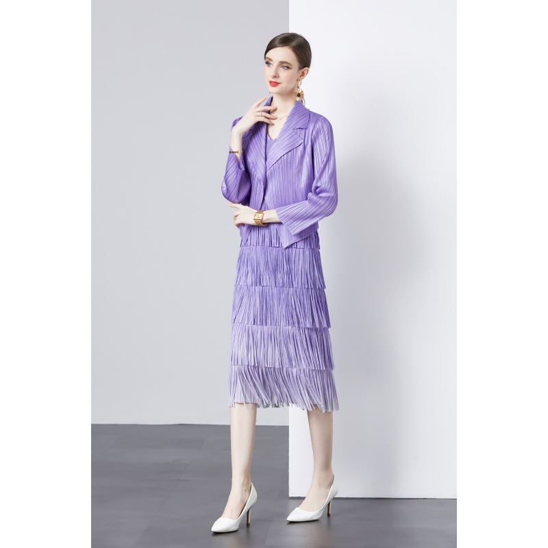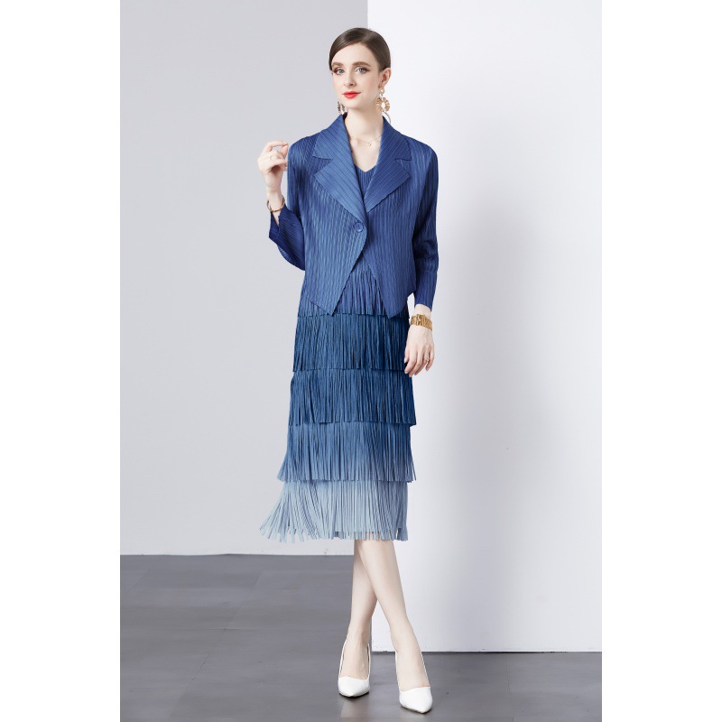 | nameOriginal | Fashion suit jacket two-piece set Sanzhai pleated socialite temperament V-neck cake skirt tassel gradient color dress |