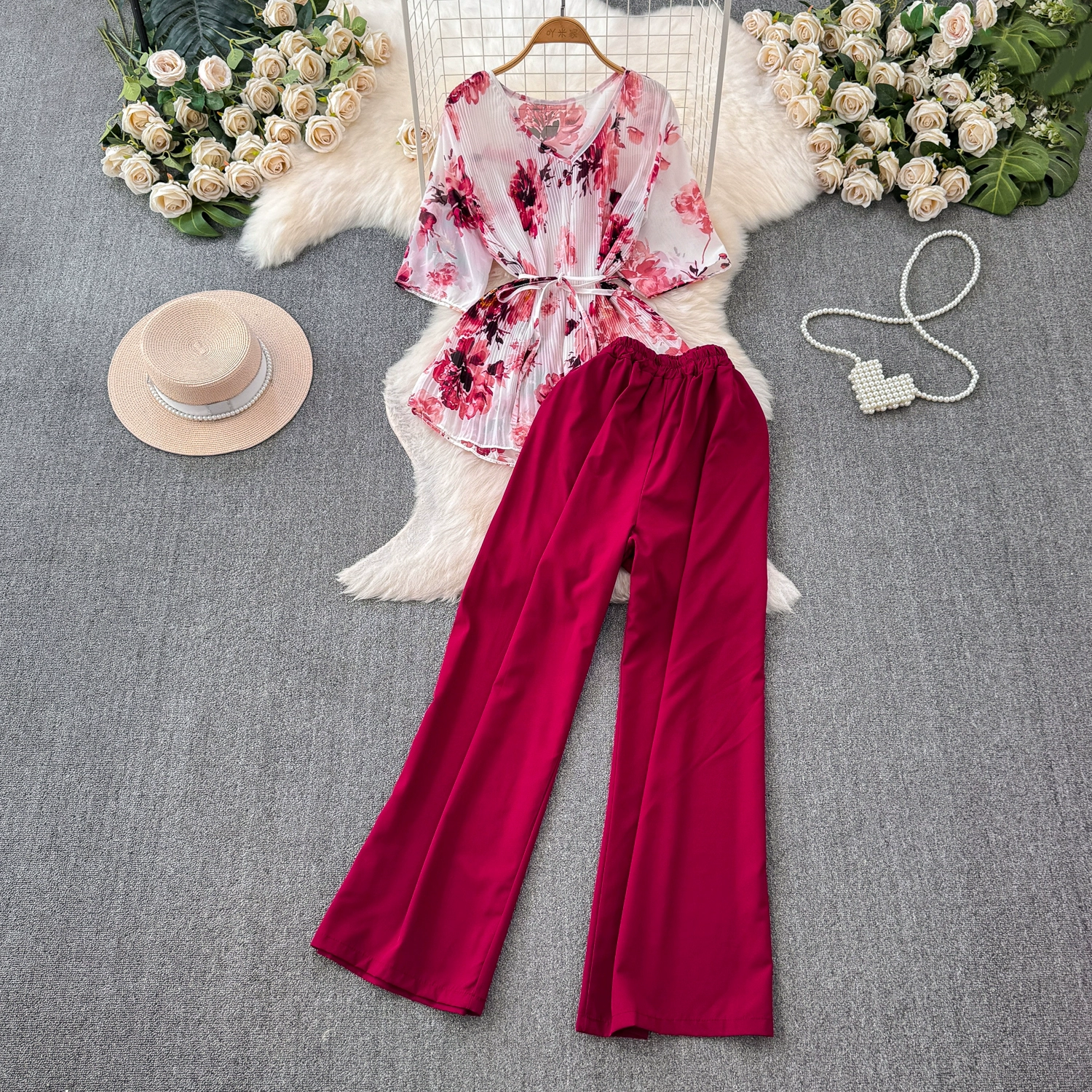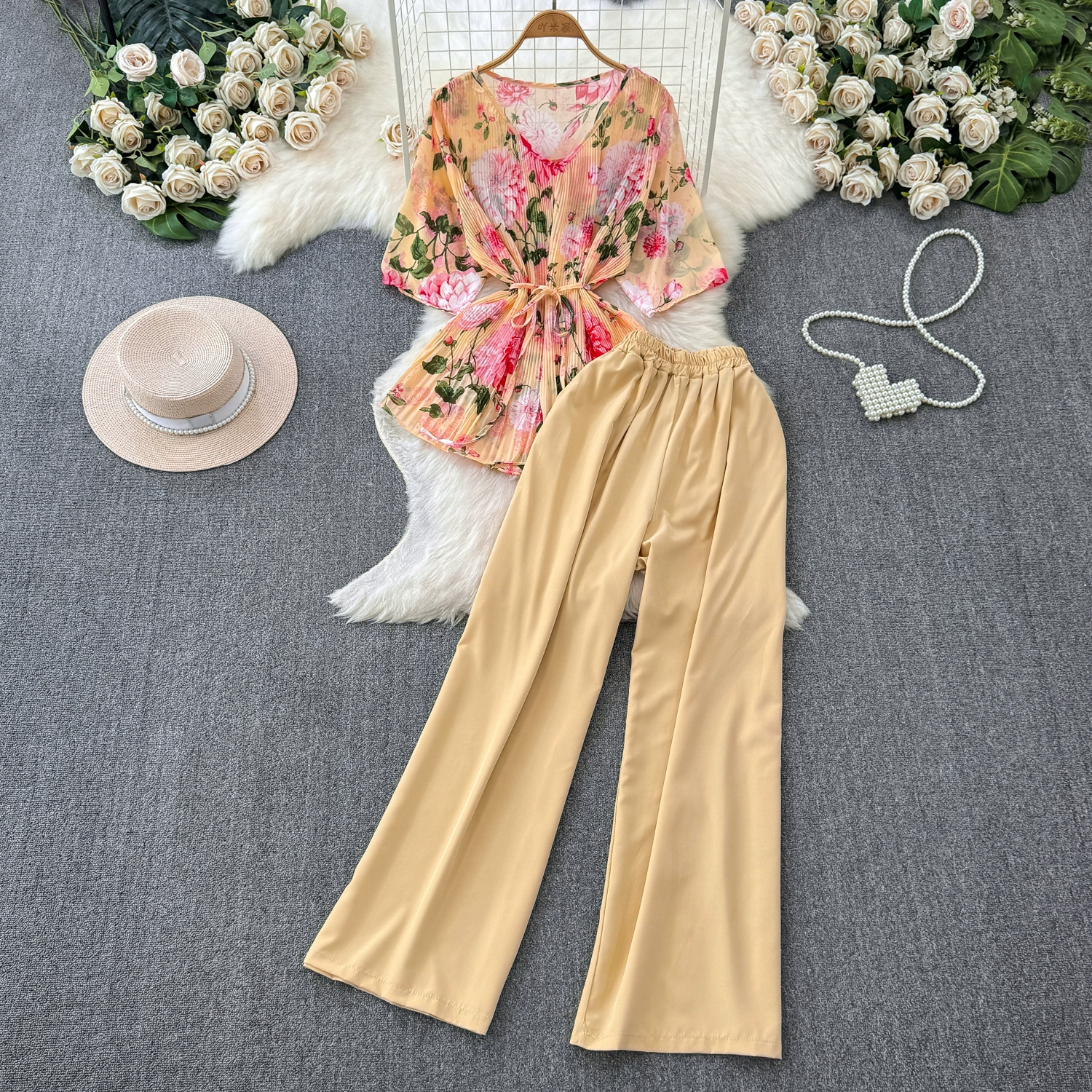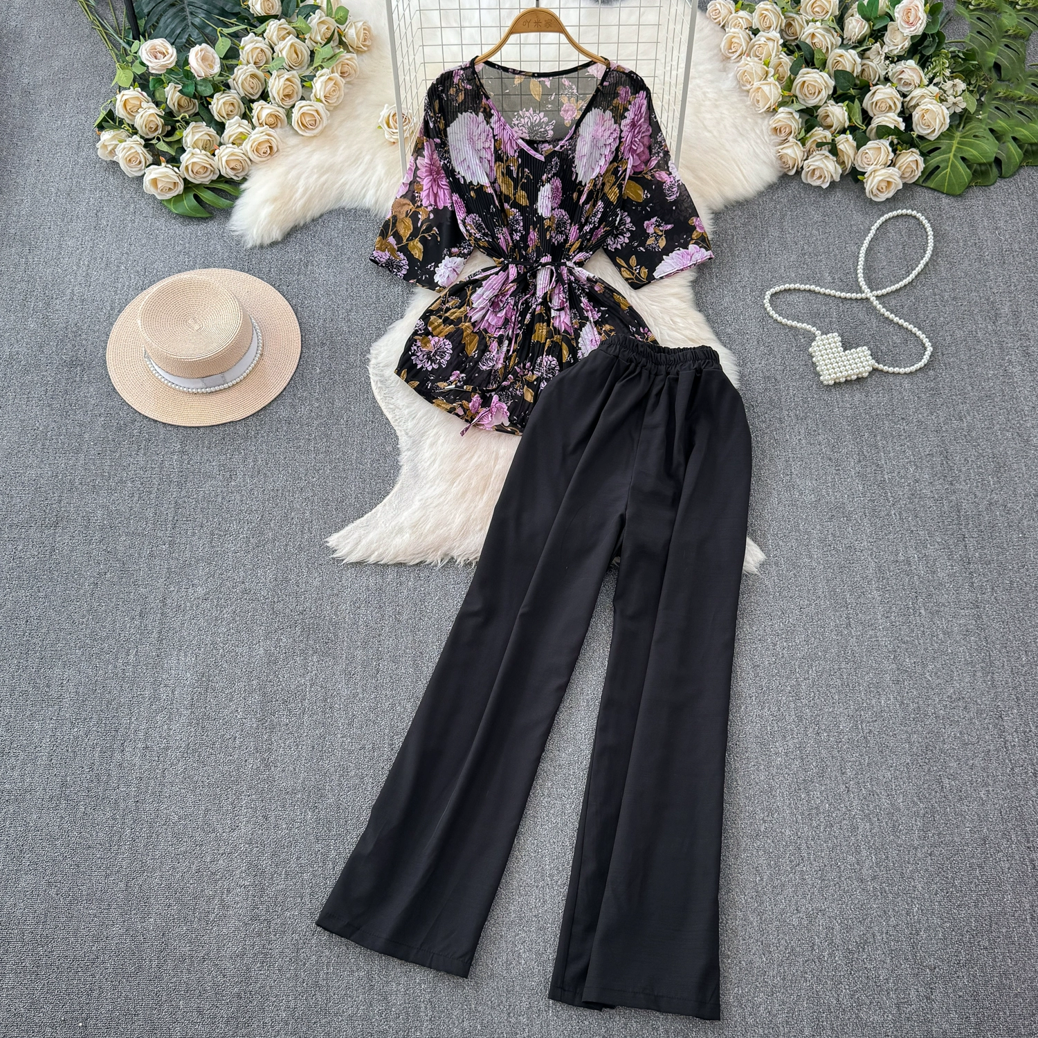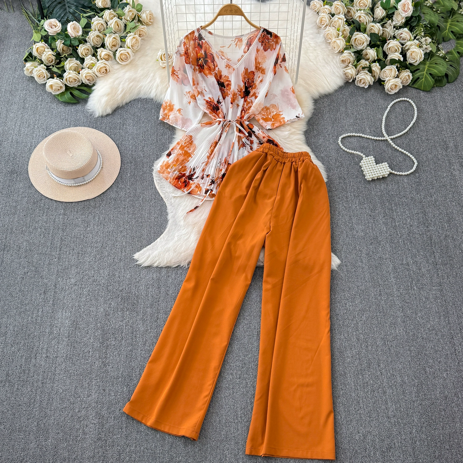 Fashion suit women’s casual European and American temperament mid-sleeve V-neck waist loose floral shirt two-piece set straight wide-leg pants