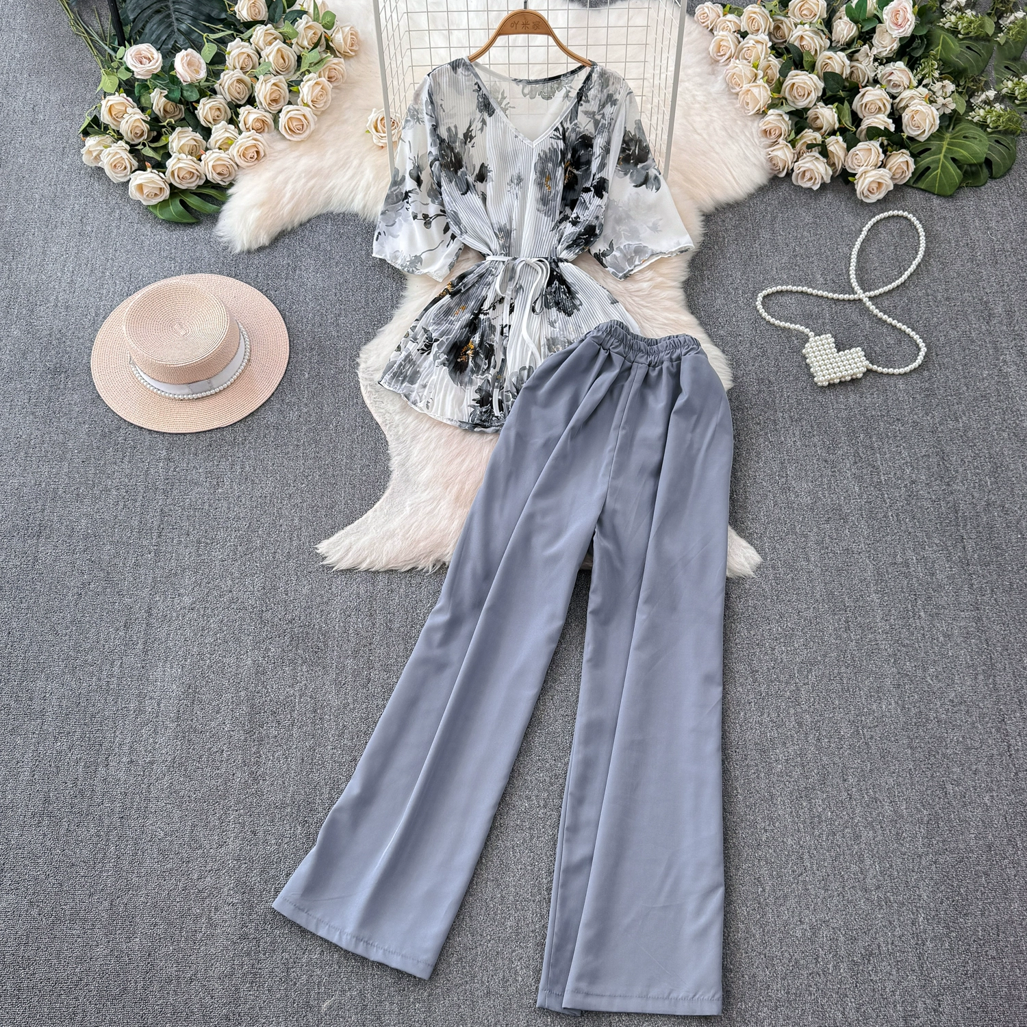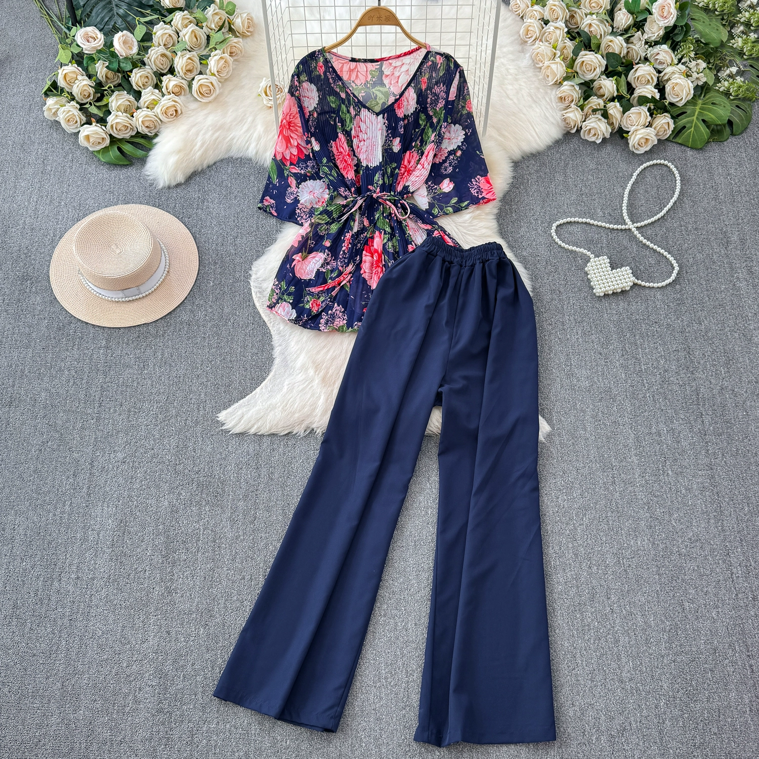 Fashion suit women's casual European and American temperament mid-sleeve V-neck waist loose floral shirt two-piece set straight wide-leg pants