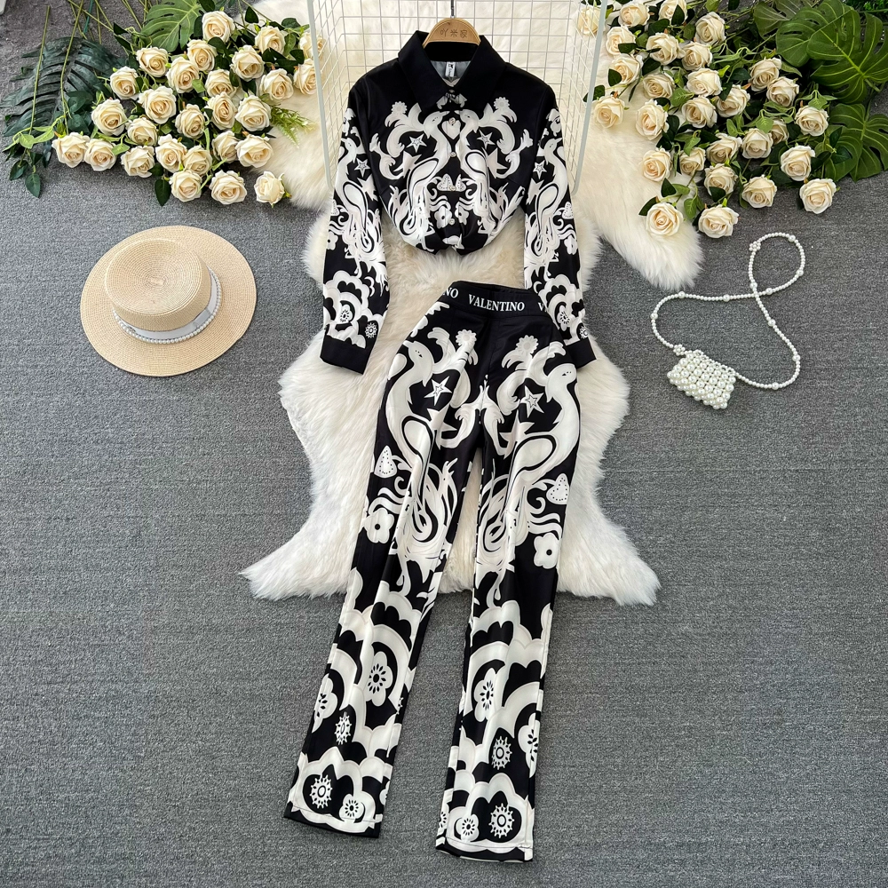 | nameOriginal | Fashion Suit Women's Korean Style Long Sleeve Lapel Loose Single Breasted Printed Shirt Two-piece Set Casual High Waist Pint Pants |