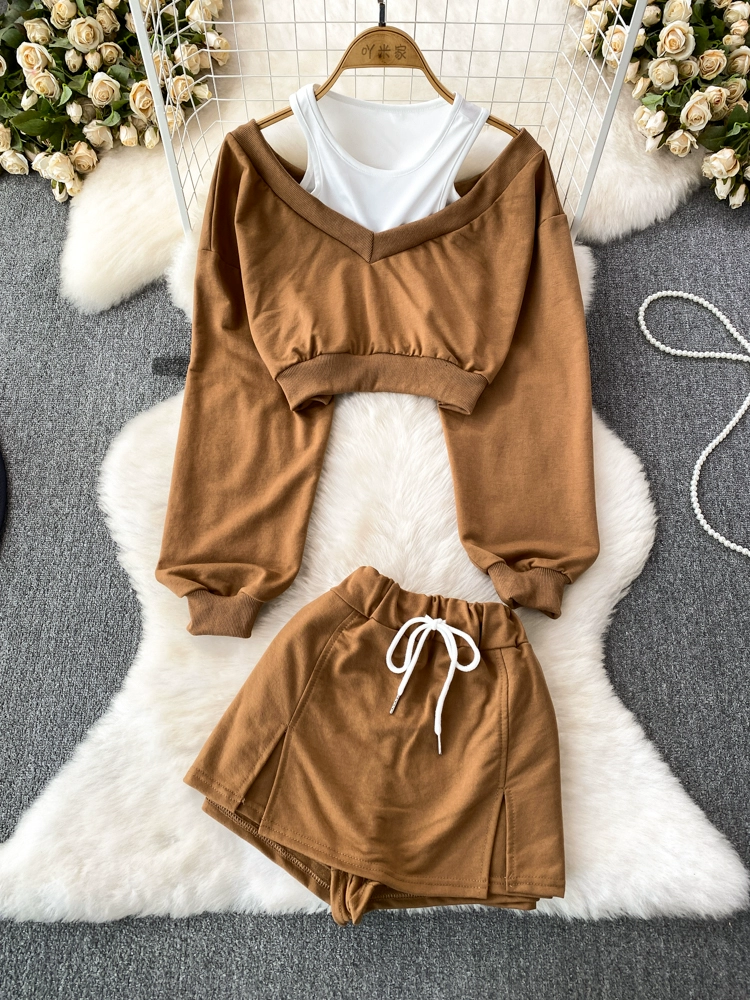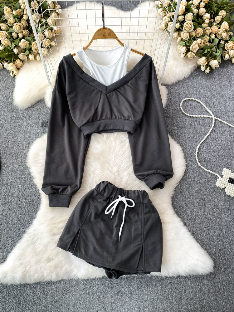 | nameOriginal | Fashion suit women's Korean style sports fake two-piece halter neck off-shoulder short sweatshirt two-piece set high waist wide leg shorts |