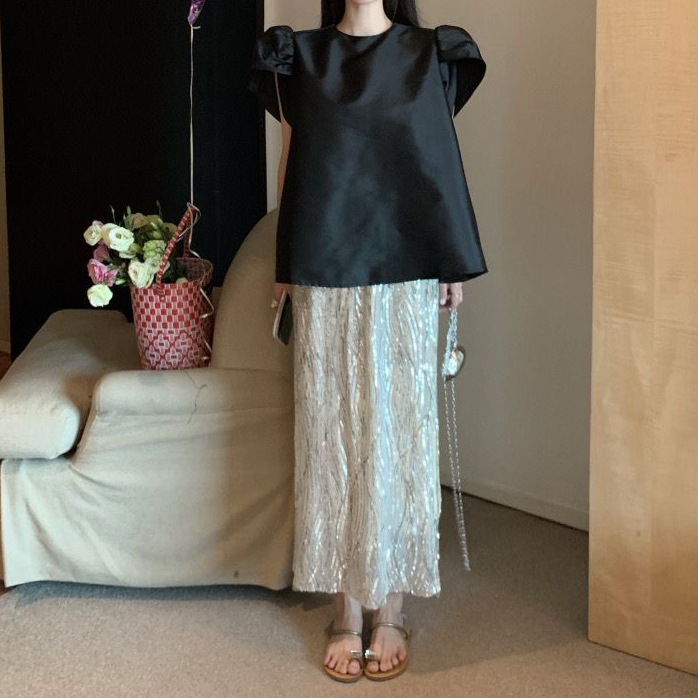 Fashion suit Women’s Retro Black Puff Sleeve Shirt Top Fairy Elegant Sequin Hip Skirt Two-piece Set