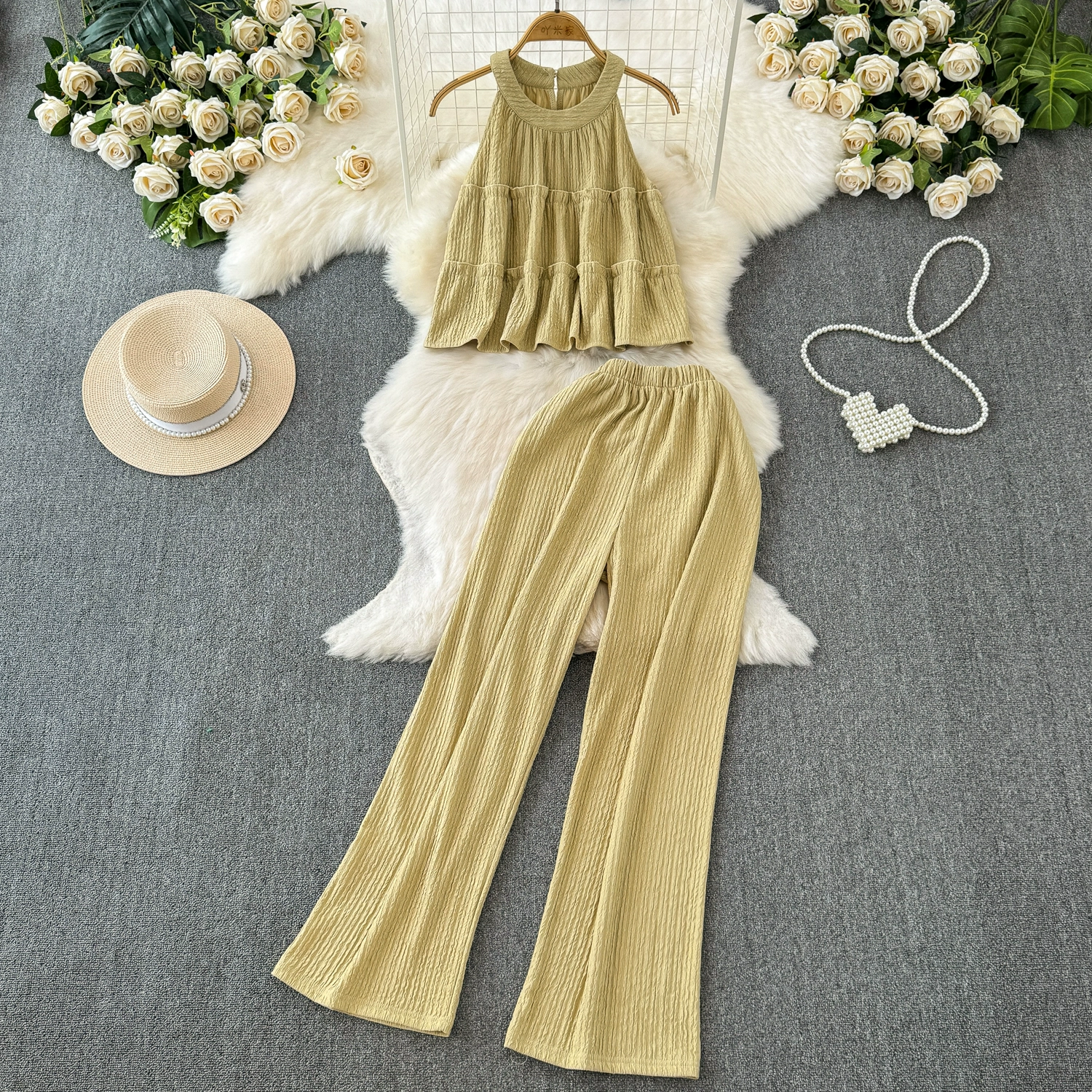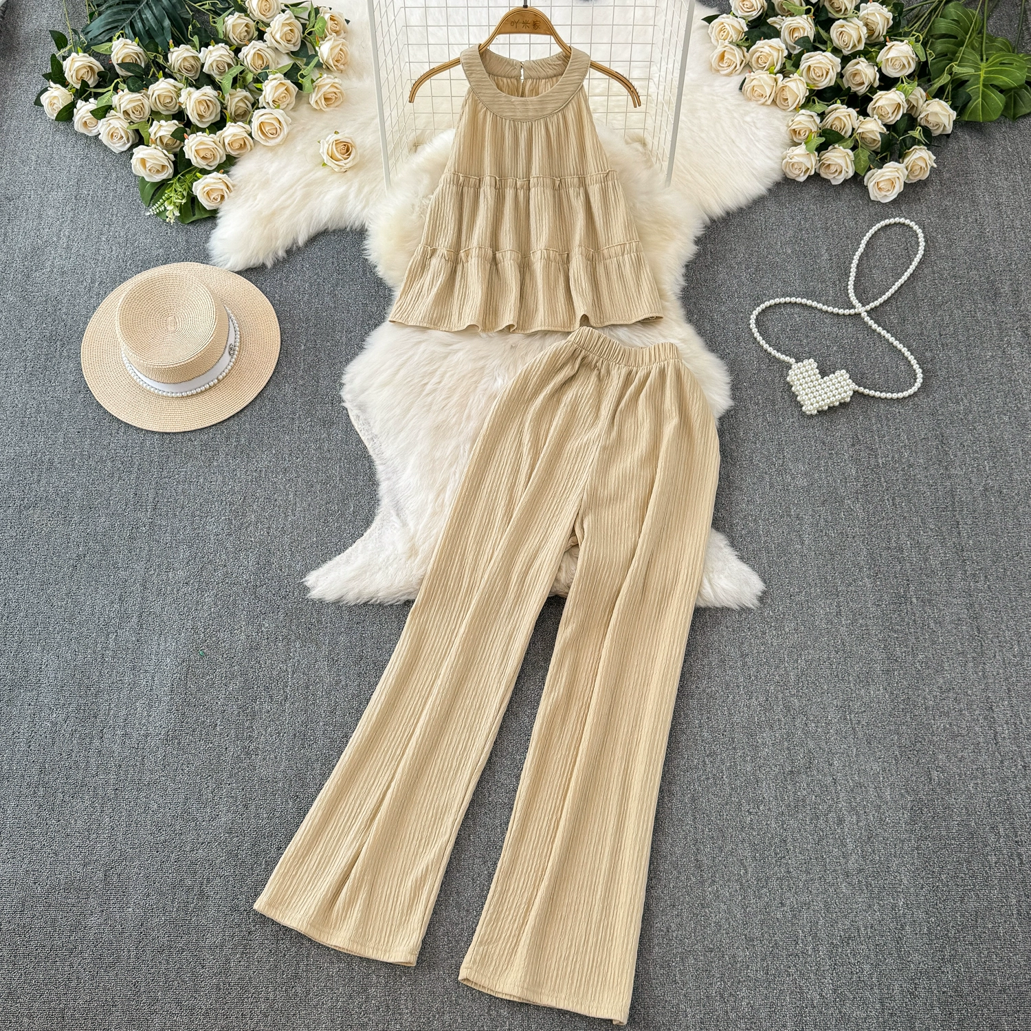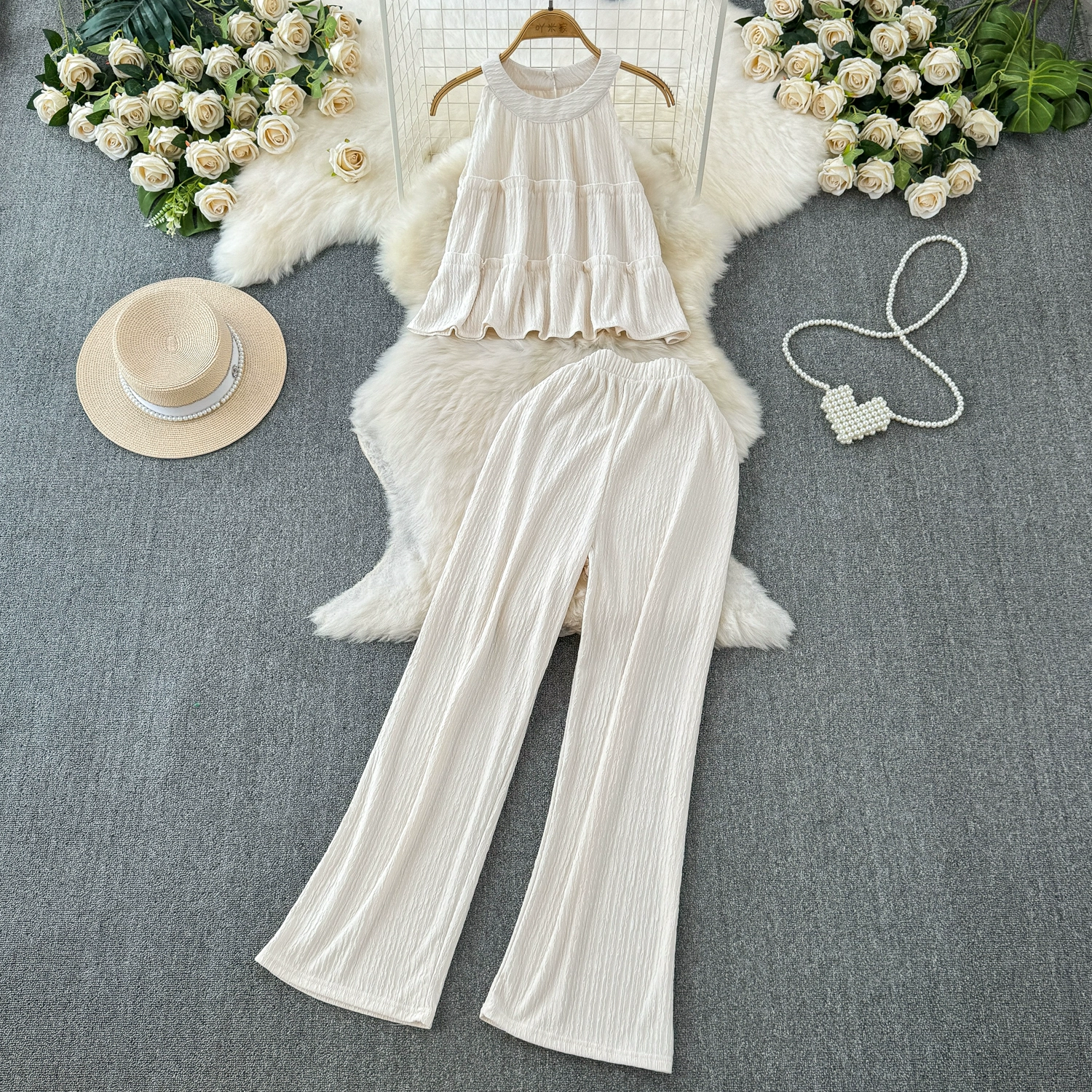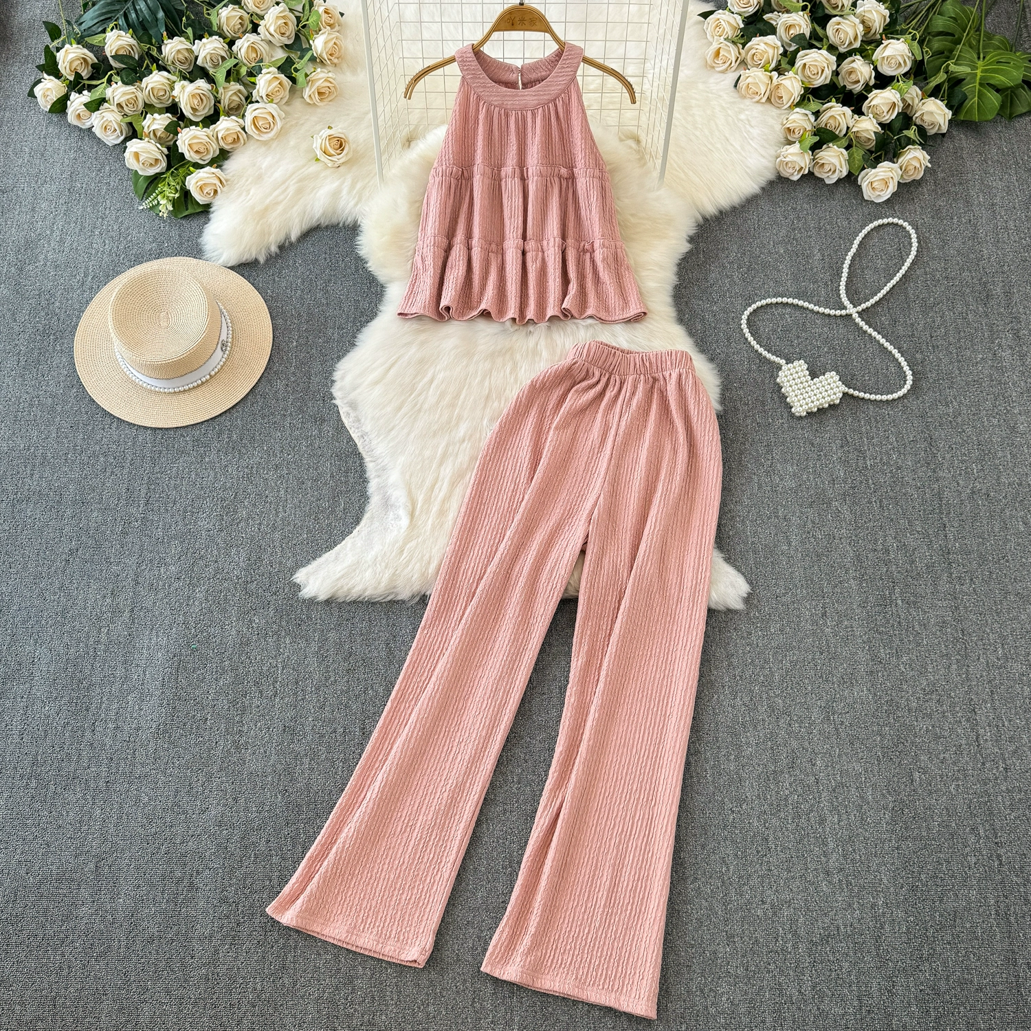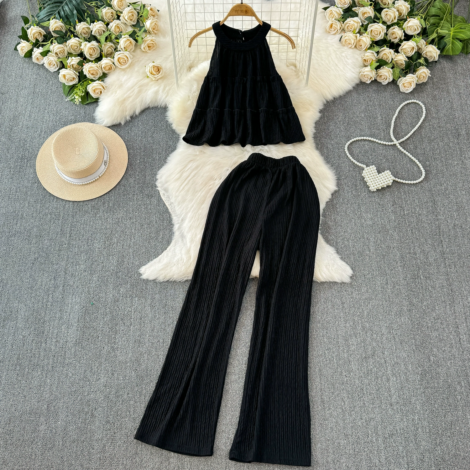 Fashion Suit Women's Summer Vest Sleeveless Round Neck Halter Slim Short Top Two-piece Set High Waisted Slimming Wide Leg Pants