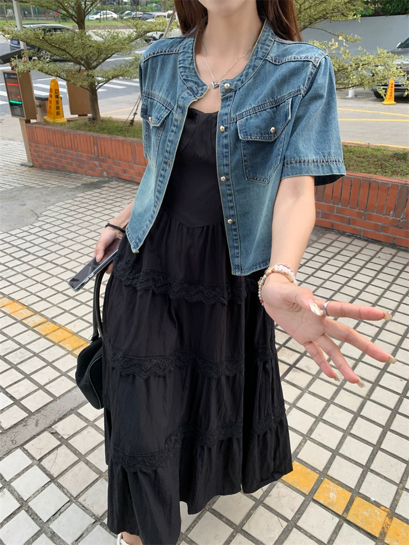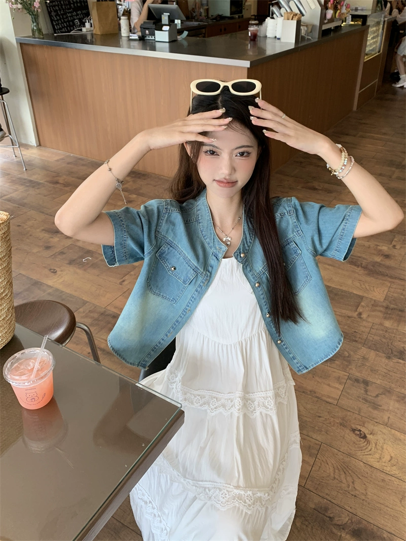Fashion Thin Denim Round Neck Women’s Retro Short Sleeves