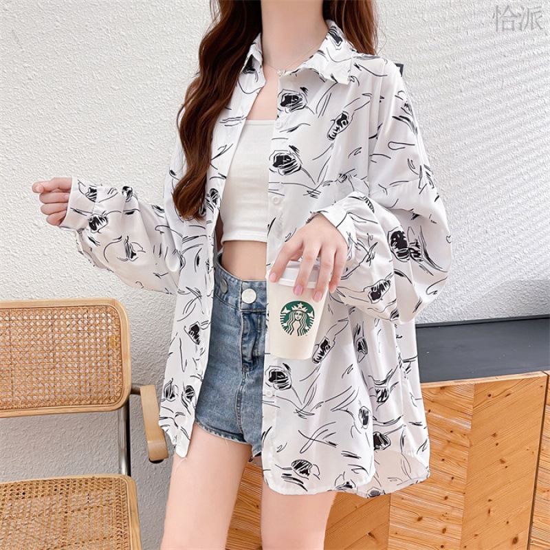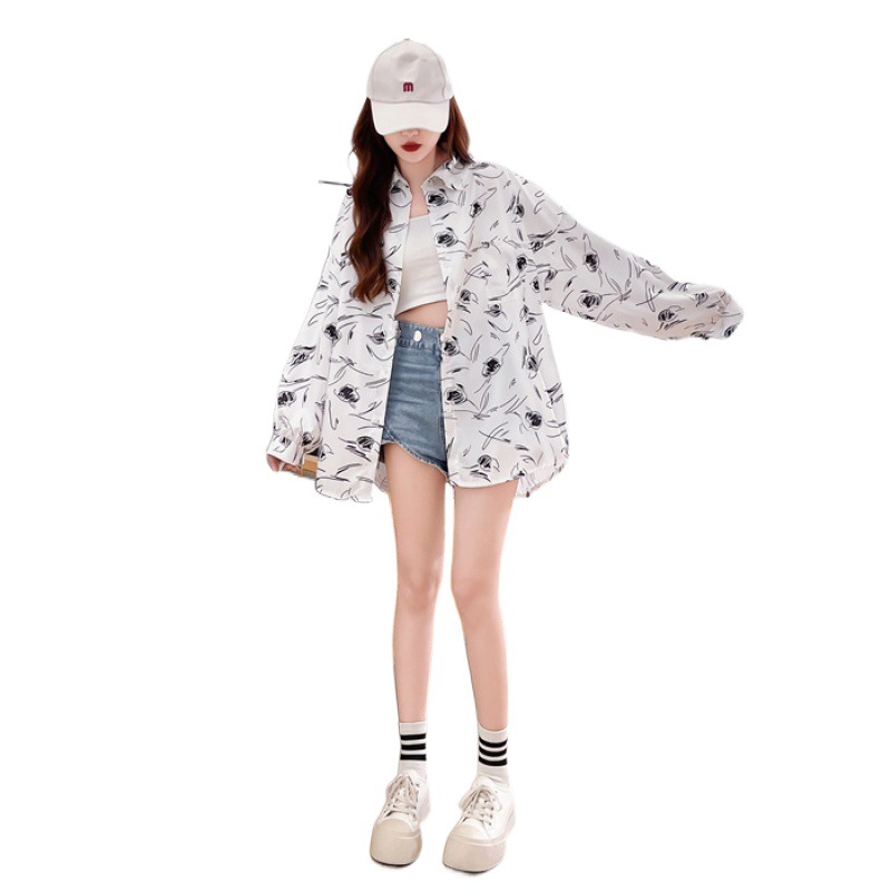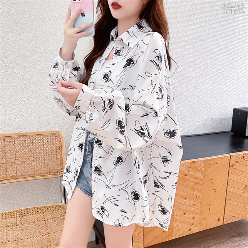 Fashionable All-match Long-sleeved Sun-protective Shirt Women’s Summer Thin Breathable All-match Printed Chiffon Mid-length Cardigan Top