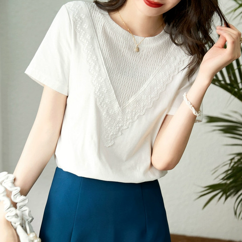 | nameOriginal | Fashionable and elegant top with lace stitching and age-reducing short sleeves |