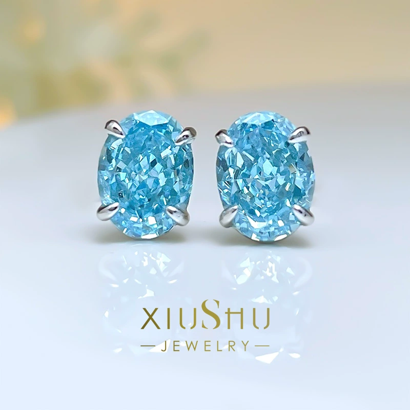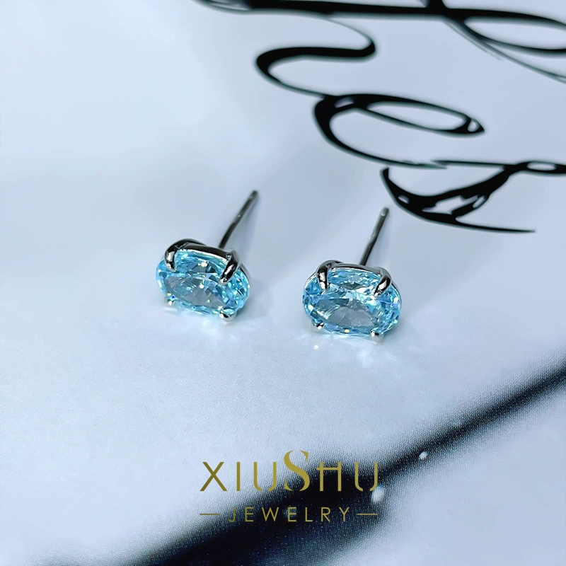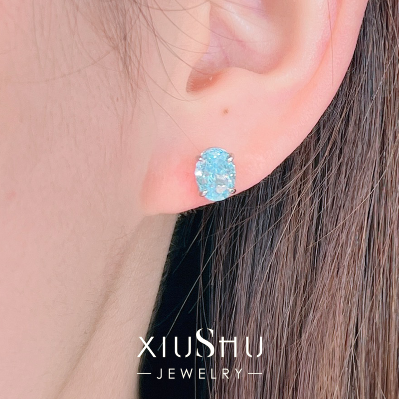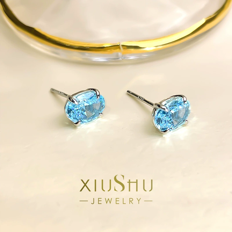 Fashionable and exquisite denier-shaped aquamarine small earrings, daily niche design, simple temperament, high carbon diamond 925 silver E248