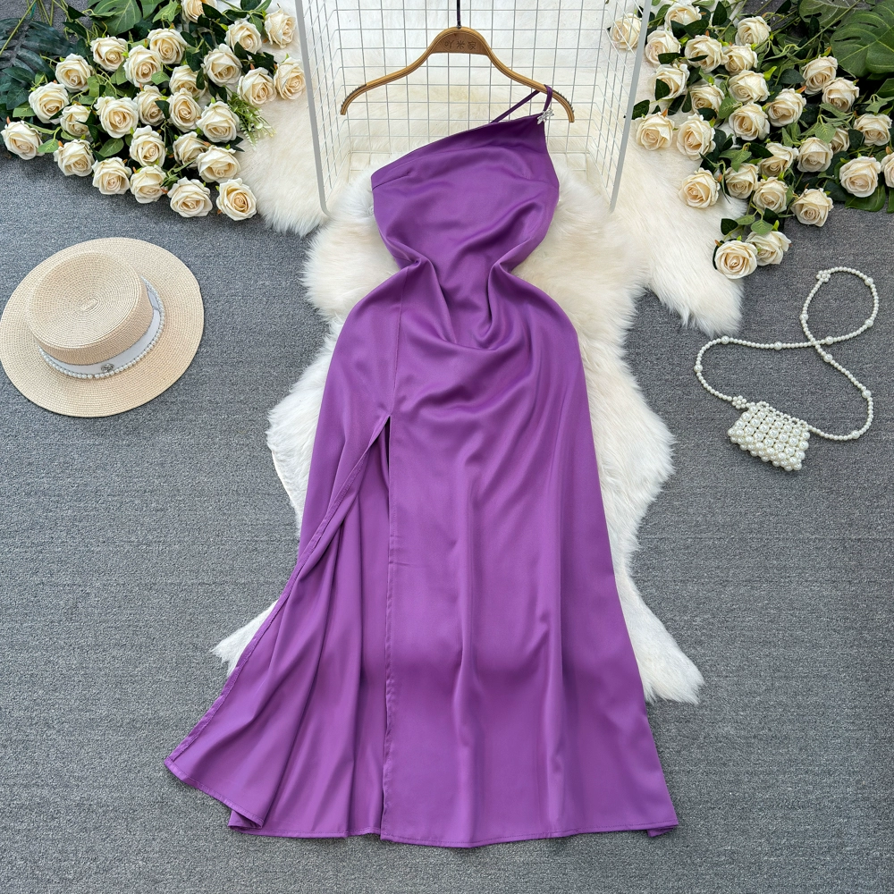 | nameOriginal | Fashionable and ladylike style, sleeveless slant collar, off-shoulder waist, revealing slit, A-line solid color dress, elegant long skirt |