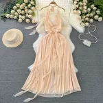 | nameOriginal | Fashionable backless a-line chiffon suspender dress with halter neck |