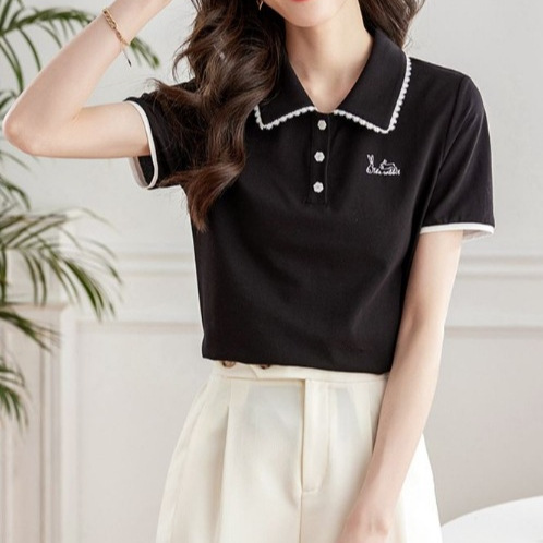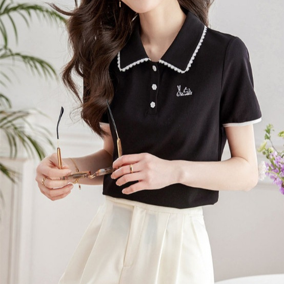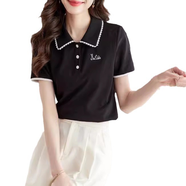 Fashionable Contrast Polo Shirt Women’s 2024 Summer New Vigorous Age-reducing Rabbit Embroidered Lace Lapel Short-sleeved T-shirt for Women