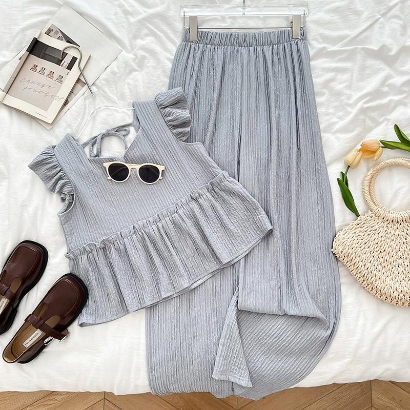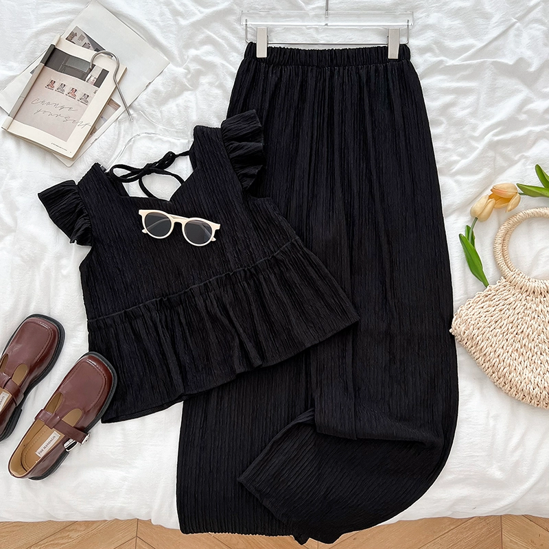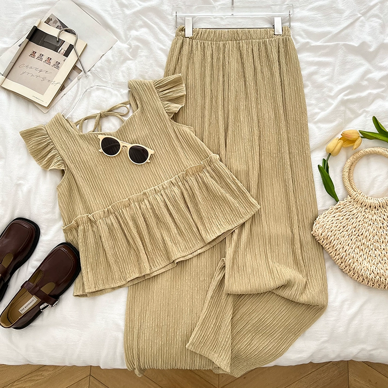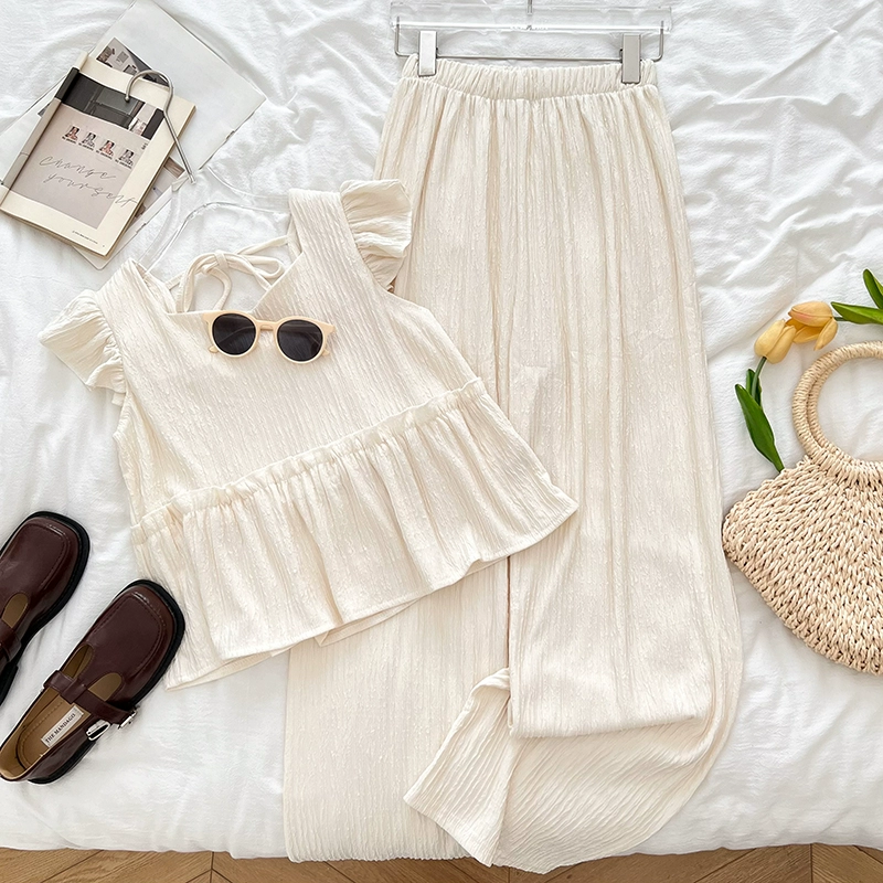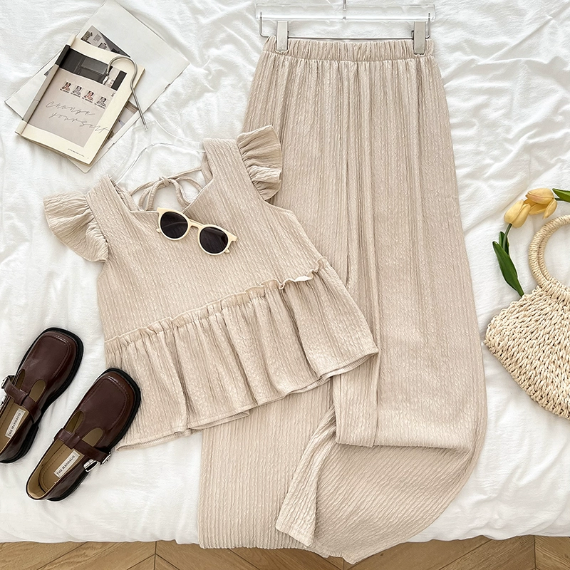| nameOriginal | Fashionable fungus-edged flying sleeve top + high-waist slim wide-leg pants casual pants straight-leg pants women's two-piece set |