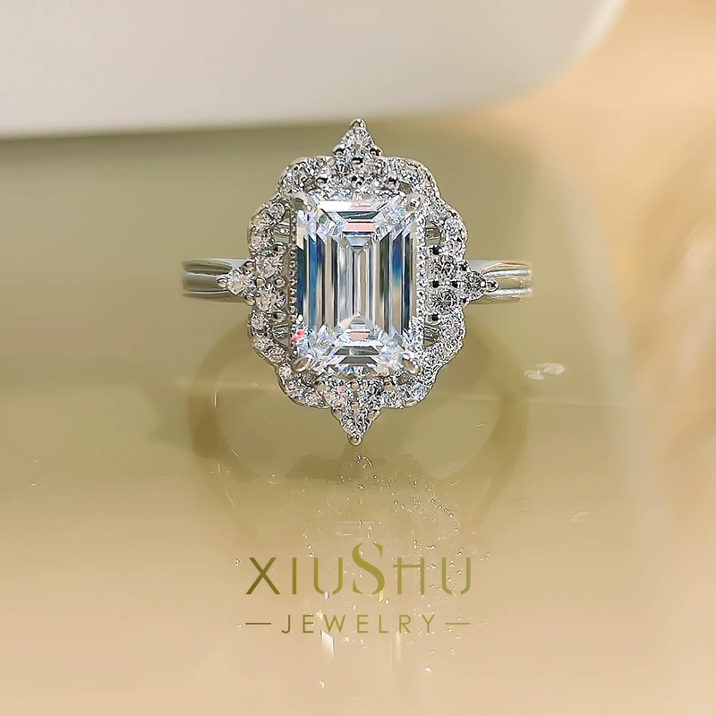 Fashionable ins style artificial emerald cut ring European and American 925 silver light luxury new style versatile Seiko niche design