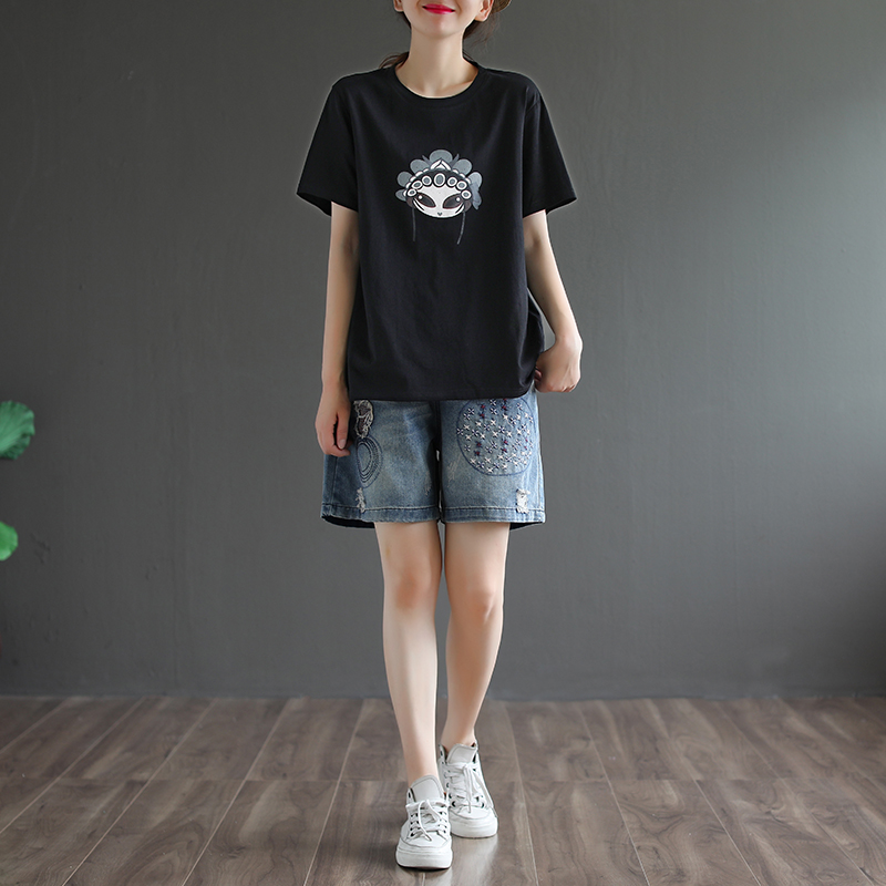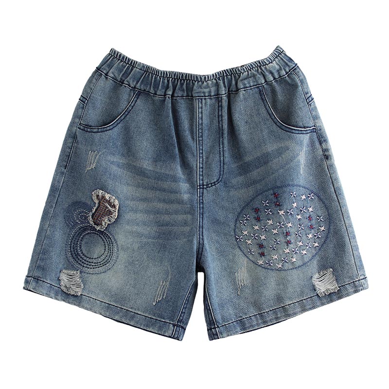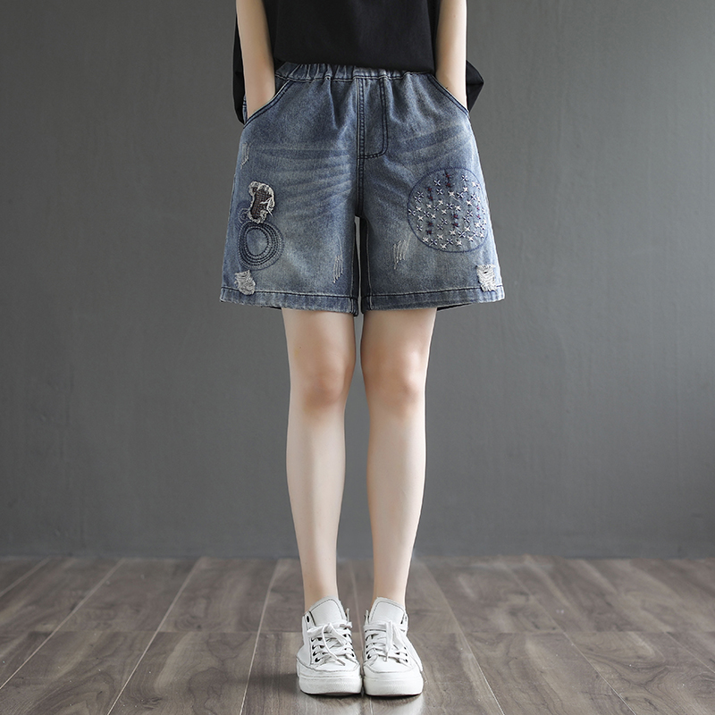 Fashionable Korean-style Ripped Embroidered Jeans Women's Summer New Arrival Loose Loose Stitching plus size Casual Short Pants