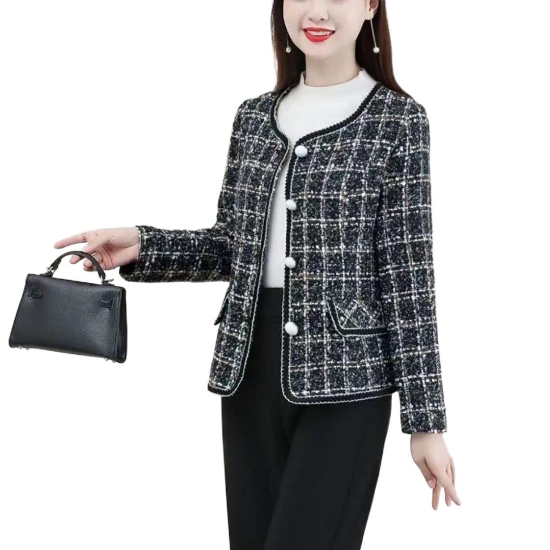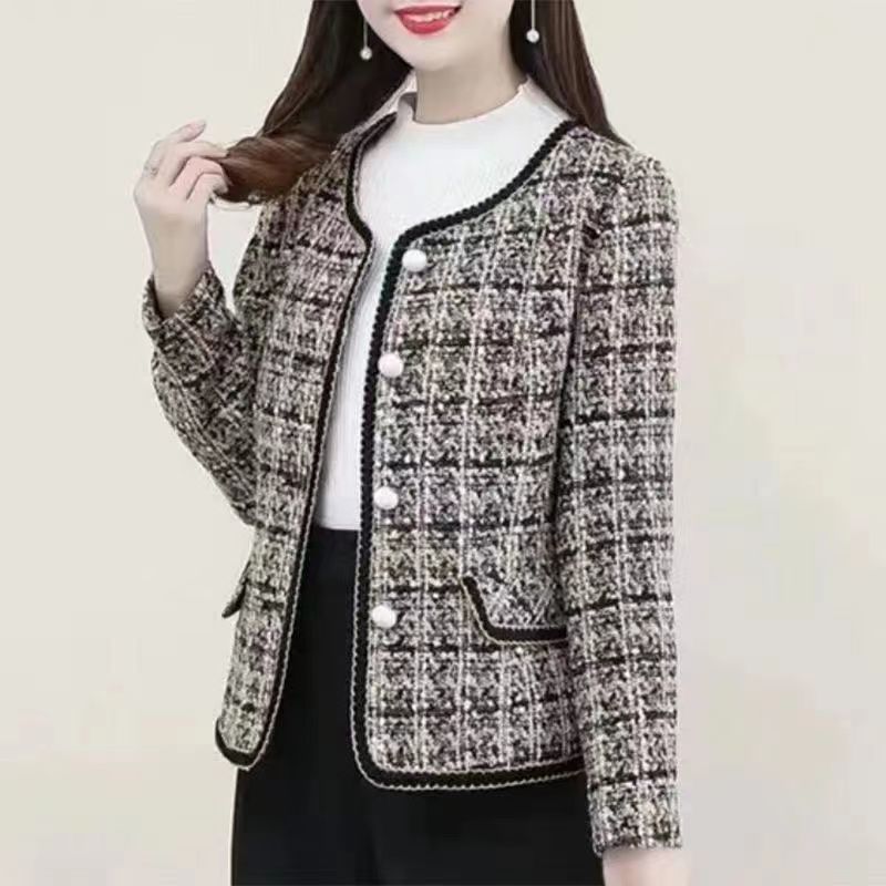 Fashionable Middle-aged Women's Chanel Style Short Coat 2022 Spring New Houndstooth Mom Crewneck Cardigan Top
