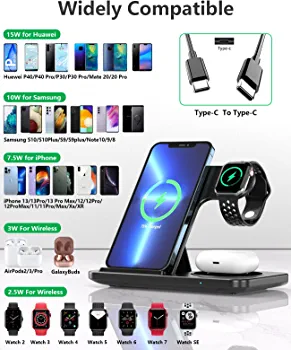 The 3-in-1 Foldable Wireless Charger offers 10W charging mode for Samsung Galaxy devices, 7.5W quick charging mode for iPhones, 3W charging mode for Galaxy Buds and Apple AirPods, and 2.5W standard charging mode for iWatch 7/6/SE/5/4/3/2. Please note that the quick charge 3.0 adapter is not included.