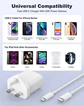 This product is a 20W USB C fast charger with a 1.5M cable that is compatible with various iPhone models, including the iPhone 14/14 Plus/14 Pro/14 Pro Max/13/13 Mini/13 Pro/13 Pro Max/12/12 Mini/12 Pro/12 Pro Max/11/11 Min/11 Pro/11 Pro Max/SE 2020/ XS/XS Max/XR/X 8 7 6 6S Plus, as well as the iPad Pro and other devices. The package includes a USB C charger plug and a 5FT cable made of fireproof material. The input is AC 100-240V 0.6A 50-60Hz, and the output is DC 5V~3A 9V~2.22A 12V~1.67A. The cord length is 1.5M (5 FT).