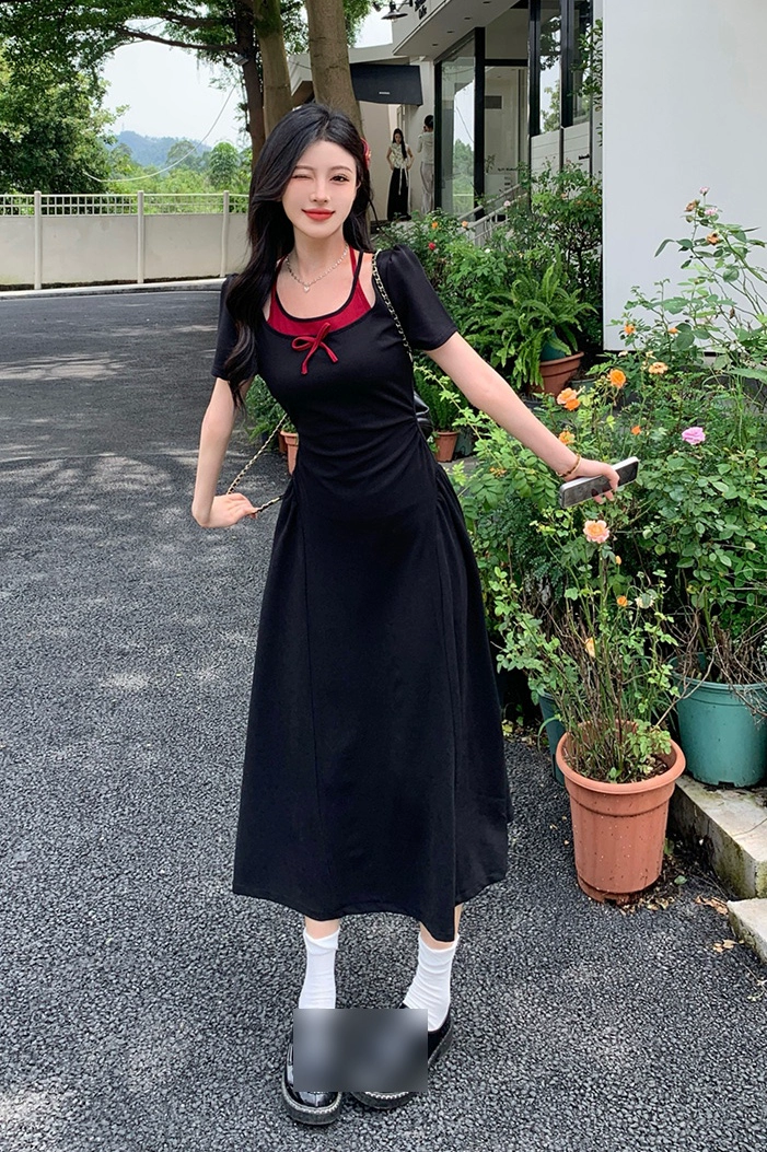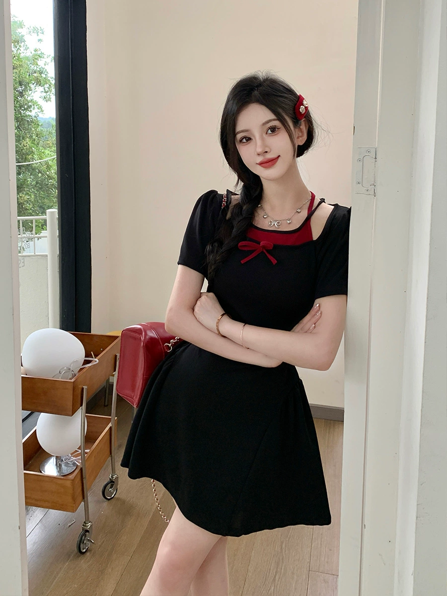 | nameOriginal | Fat girl French pleated contrast color hip-hugging short-sleeved dress |