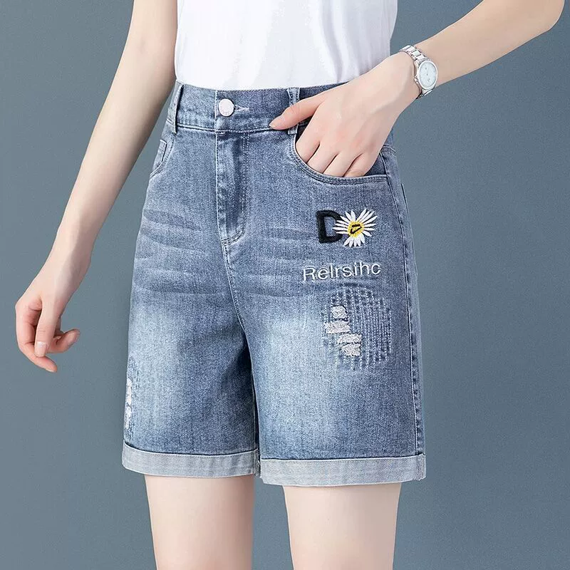 Fat girl loose large size elastic waist denim shorts for women slim students mid-trousers fat mm summer elastic five-point pants trendy