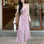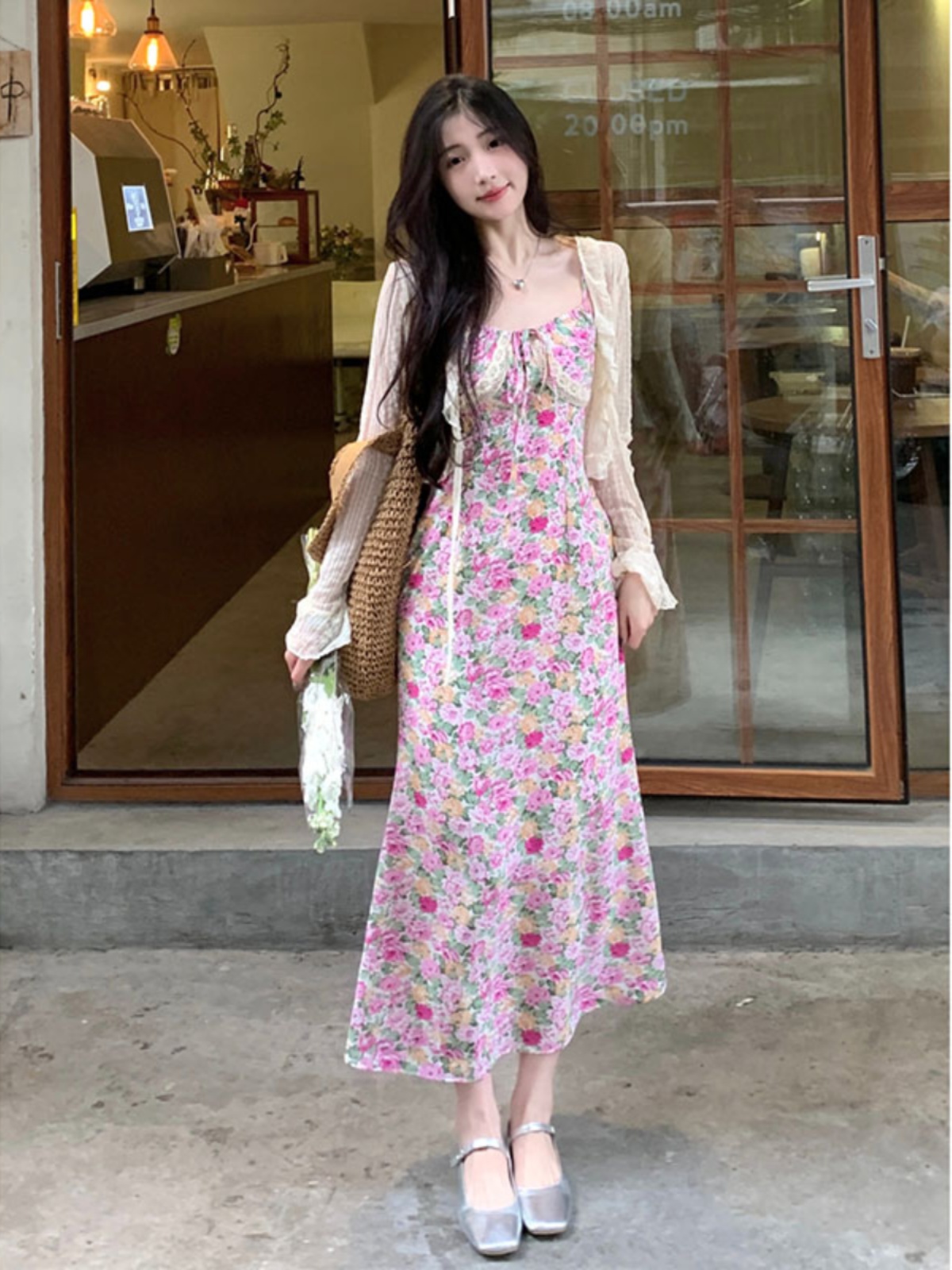 Fat girl slim-fitting long skirt cardigan two-piece set with floral suspenders