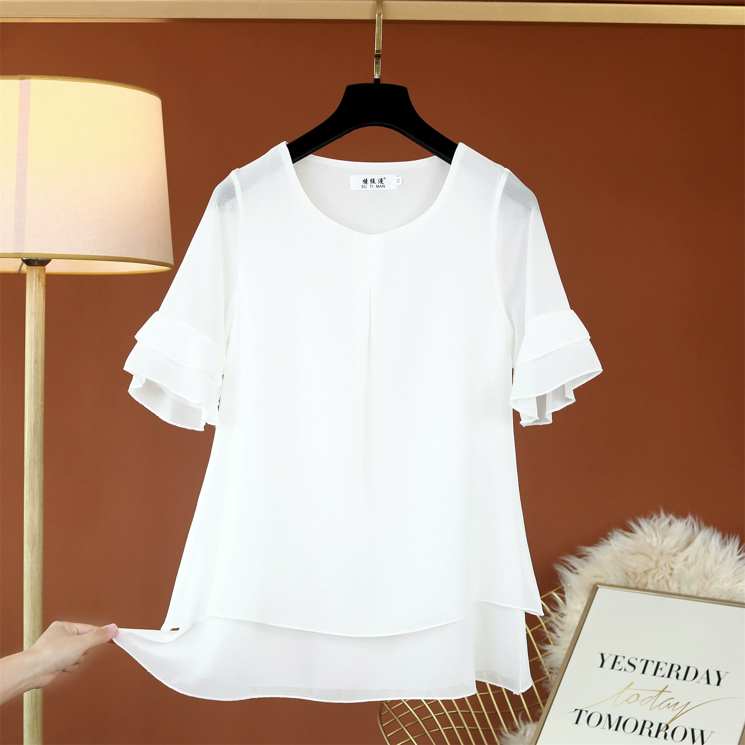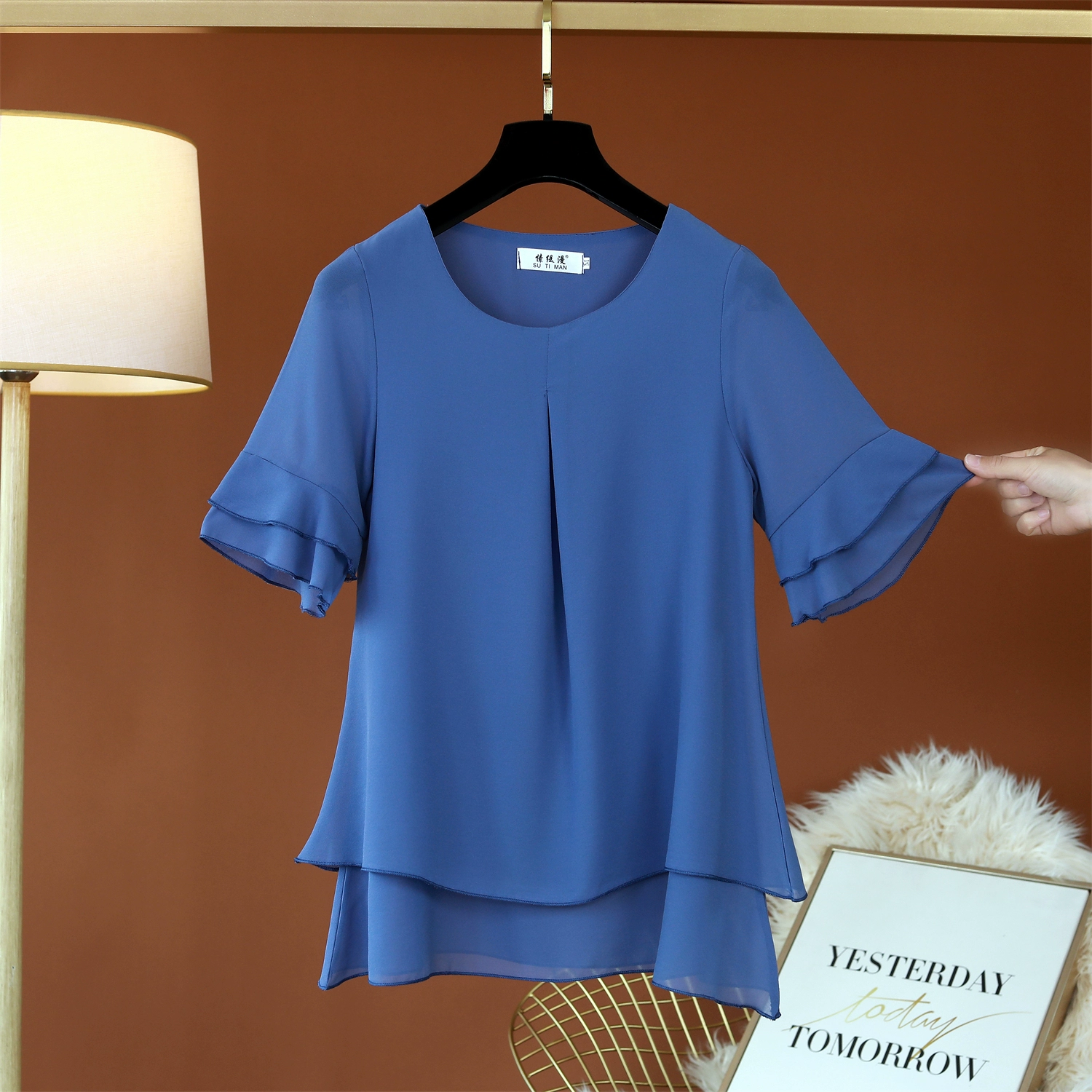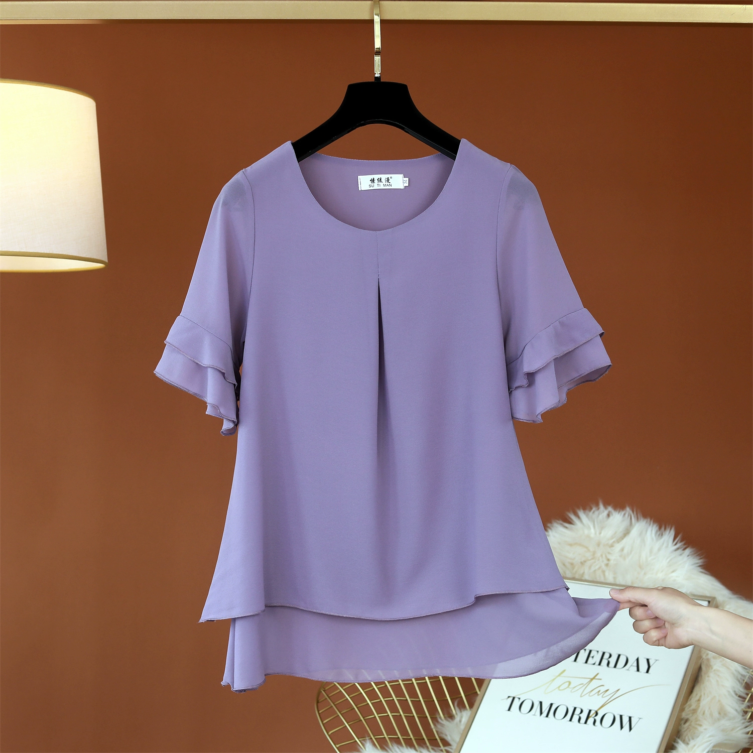 | nameOriginal | Fat girl's belly-covering lotus leaf short-sleeved top loose chiffon shirt |