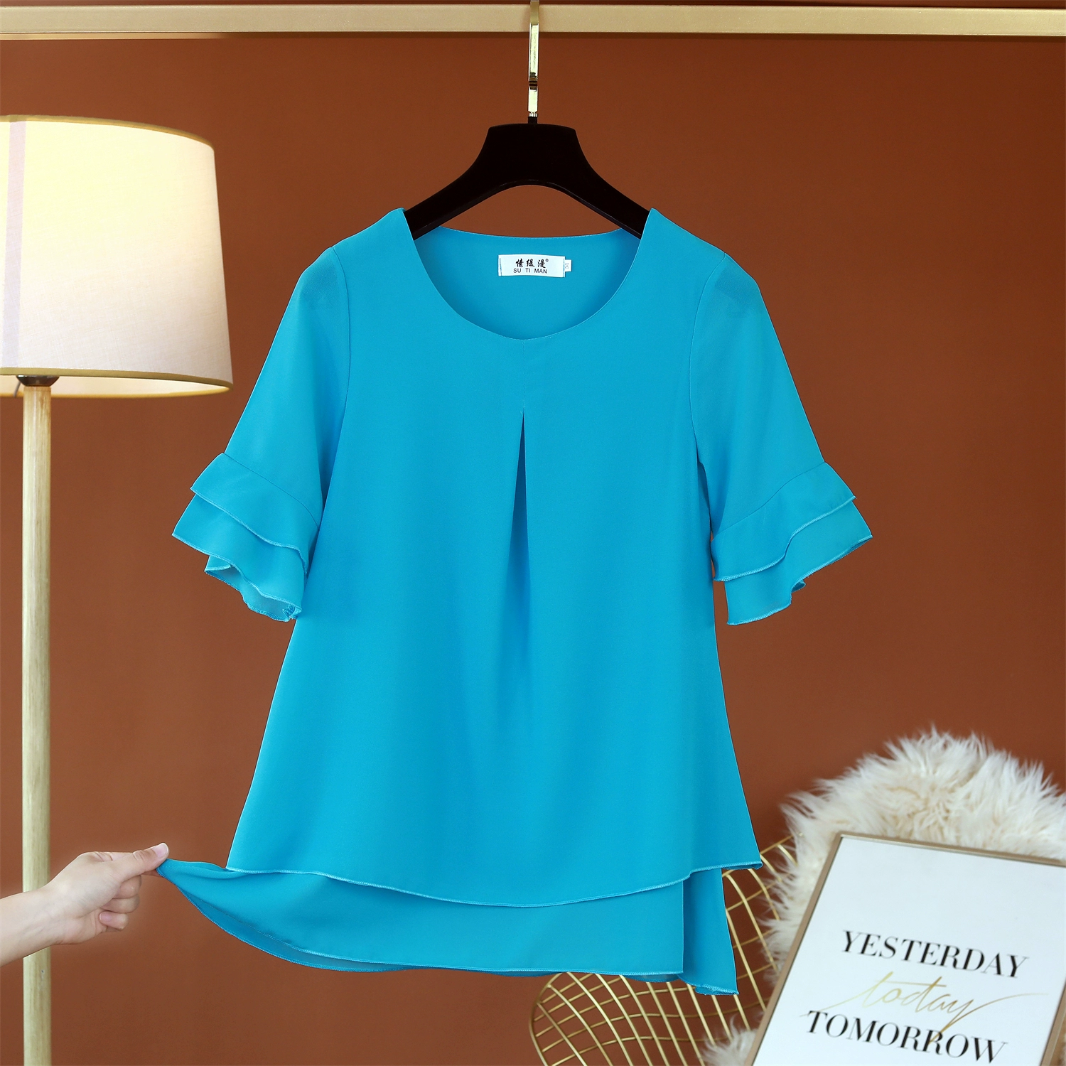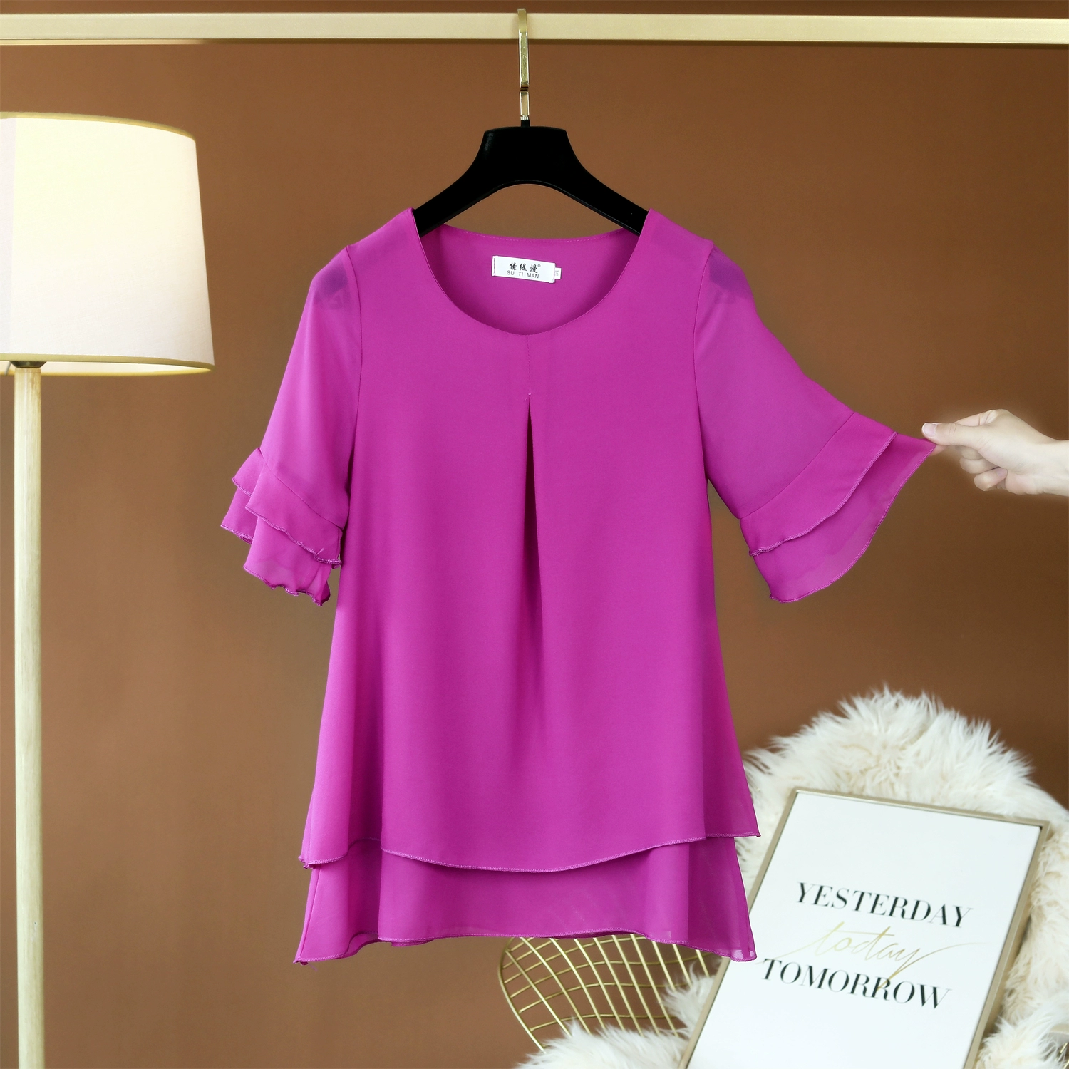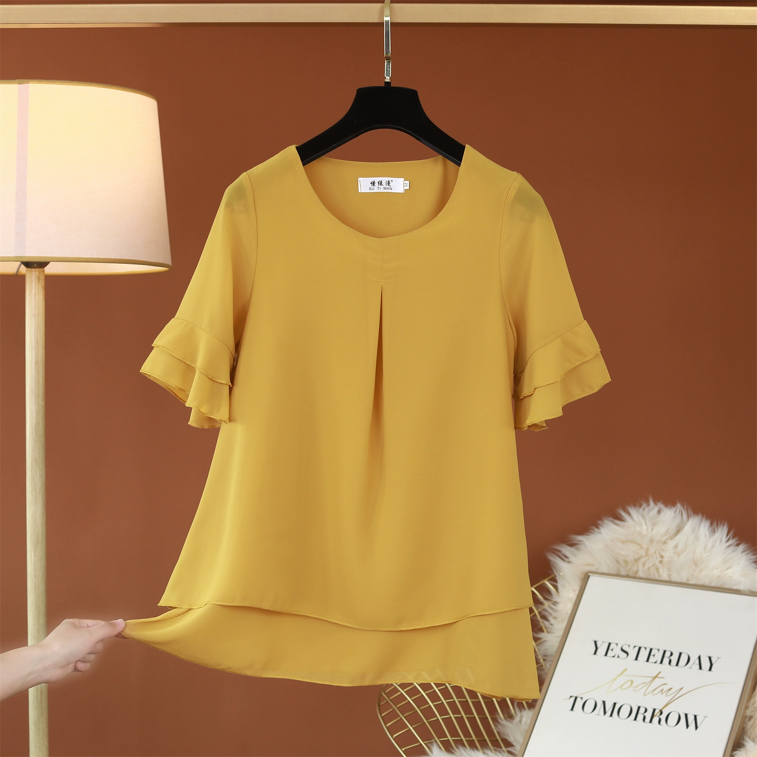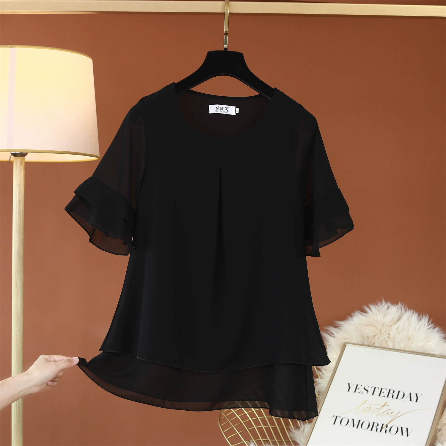 | nameOriginal | Fat girl's belly-covering lotus leaf short-sleeved top loose chiffon shirt |