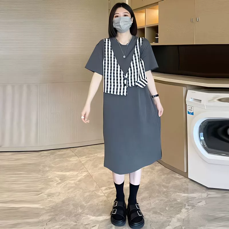 Fat mm plus size 2-300 pounds fake two-piece T-shirt long skirt women's summer loose slimming dress trendy