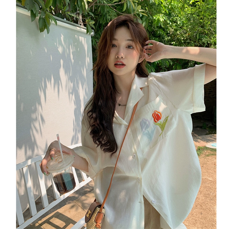 | nameOriginal | Fat mm short-sleeved shirt loose top with tulip embroidery |