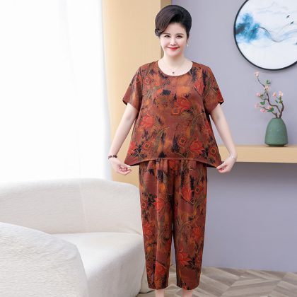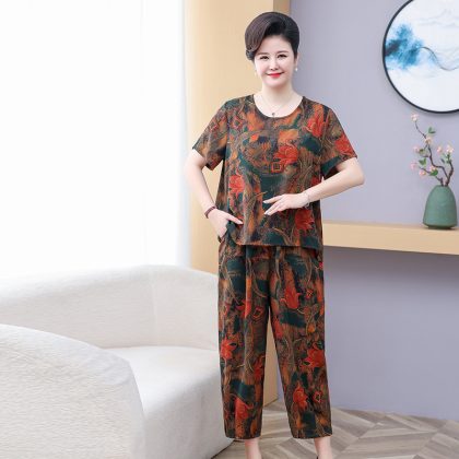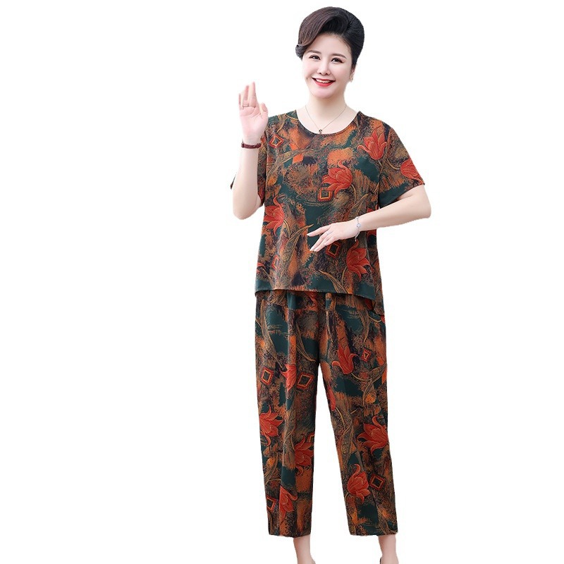 | nameOriginal | Fat mother summer short sleeve suit foreign style loose plus fat plus size grandma 200kg middle-aged two-piece set for women |