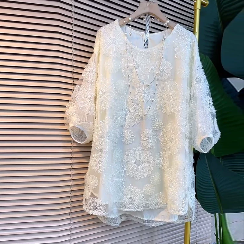 French niche flower lace shirt with large size short sleeves