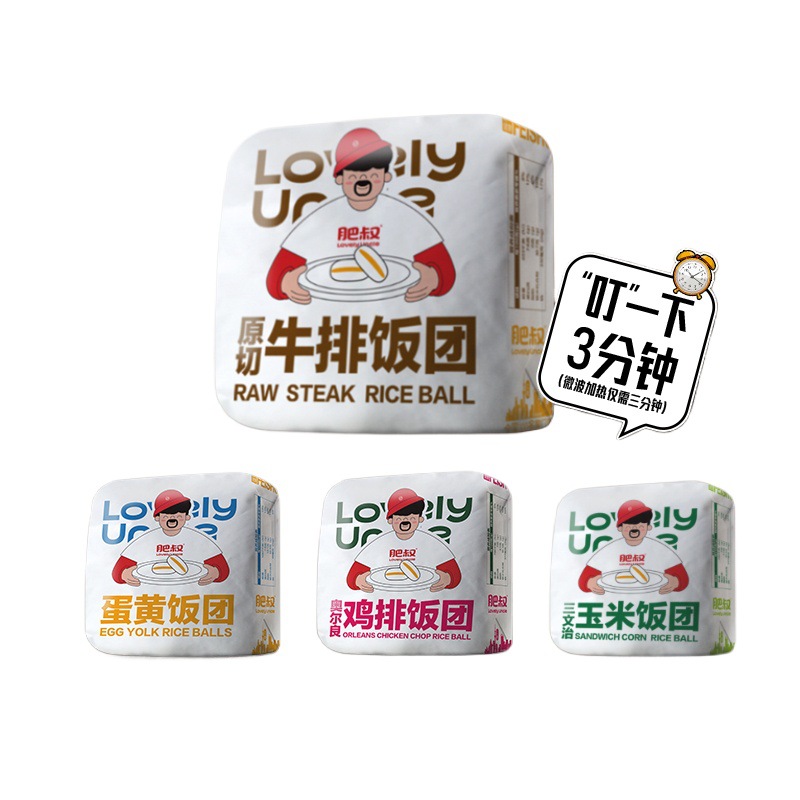 | nameOriginal | Fat uncle rice ball 8 salted egg yolk chicken steak glutinous rice rice ball purple rice hamburger children's breakfast microwave instant rice |