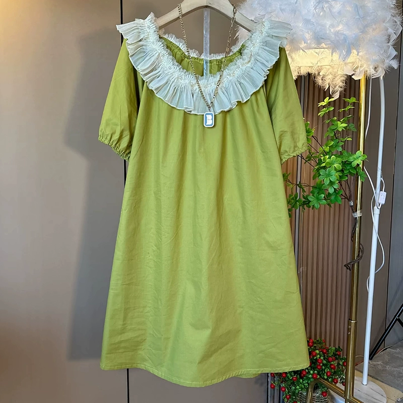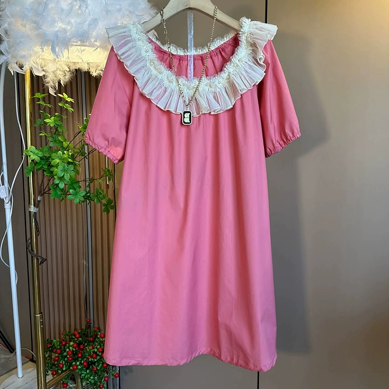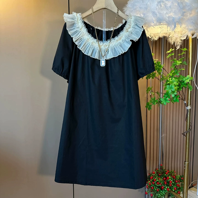 Fattened color-blocked mesh collar casual short-sleeved dress