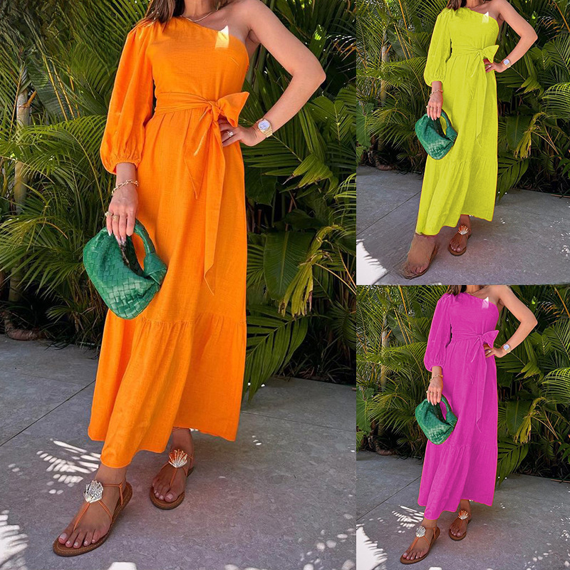 FD1188 spot 2023 spring new cross-border women’s fashion temperament oblique shoulder long cotton and linen dress