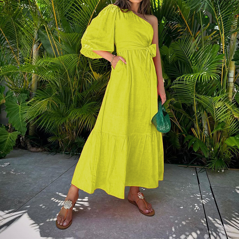 FD1188 spot 2023 spring new cross-border women's fashion temperament oblique shoulder long cotton and linen dress