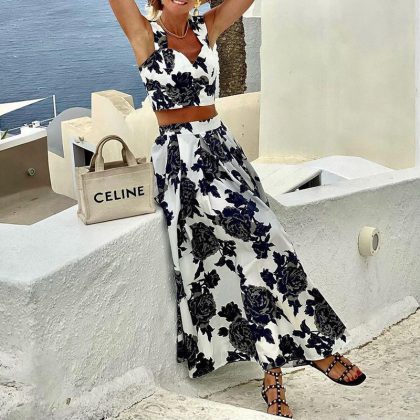 FD1710 Spring and Summer 2024 New Cross-border Women’s Fashion Elegant Printed Mid-length Half-length Top Dress Two-piece Set
