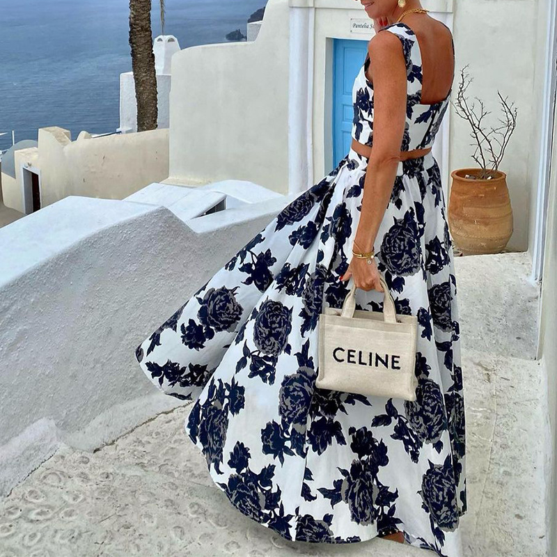 FD1710 Spring and Summer 2024 New Cross-border Women's Fashion Elegant Printed Mid-length Half-length Top Dress Two-piece Set