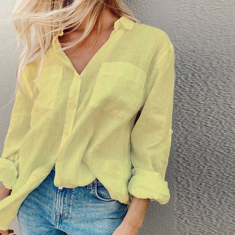 | nameOriginal | FD923 spot 2024 spring new ladies fashion solid color long sleeve lapel holiday style cotton and linen shirt |