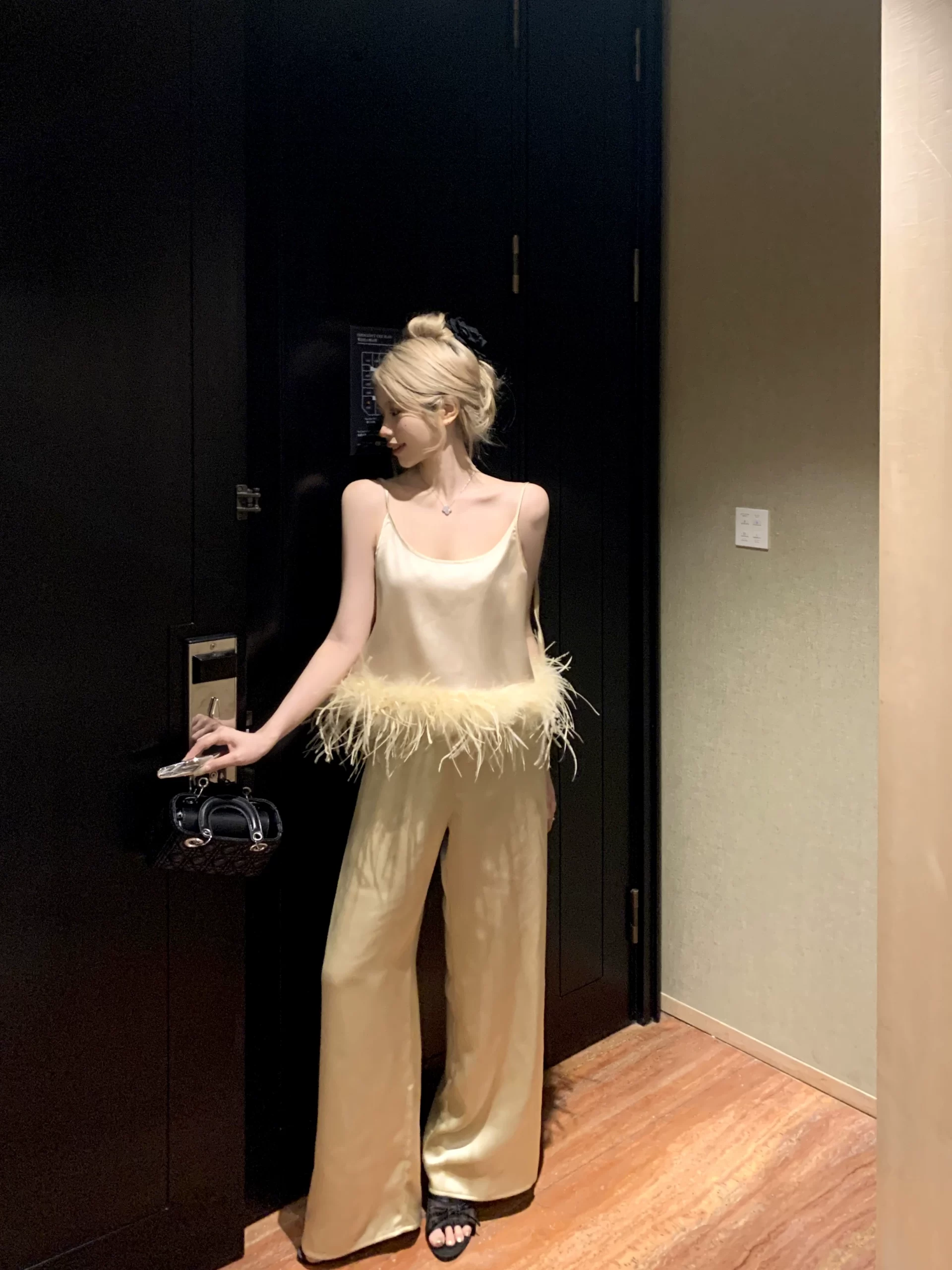 | nameOriginal | Feather patchwork wide-leg casual pants two-piece suspender set |