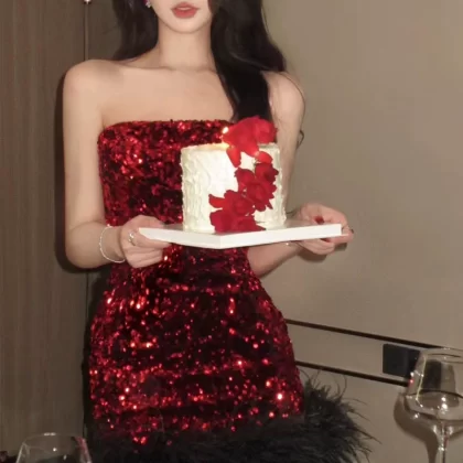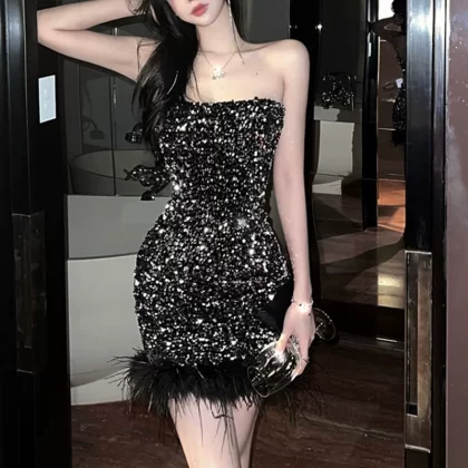 | nameOriginal | Feather sequin strapless slim fit hip-hugging dress |