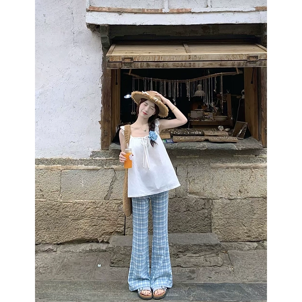 | nameOriginal | Feifei sleeve blue plaid bootcut pants suit with suspenders |