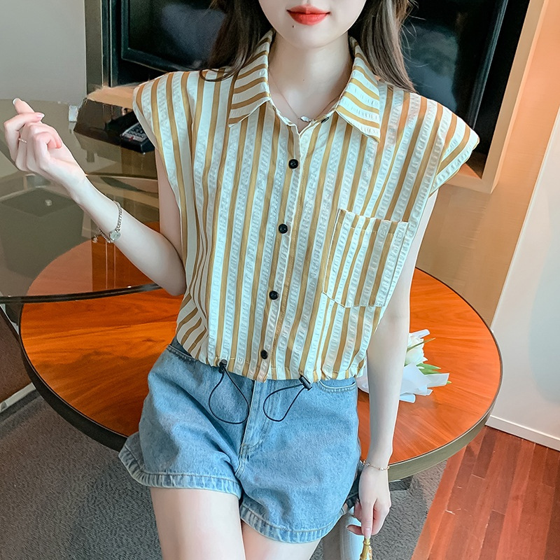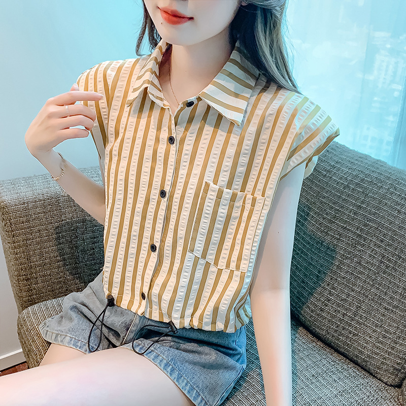 | nameOriginal | Feifei Sleeve Striped Shirt Women's 2023 New Summer Design Niche Drawstring French Short Sleeveless Top |